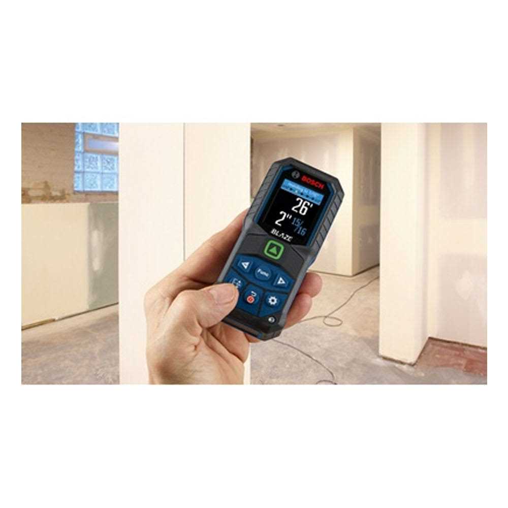 This 165 Ft. green-beam laser measure is a fully featured tool with an easy-to-read color display, great accuracy and reinforced housing for durability. The Bosch BLAZE GLM165-25G uses green-beam technology, which generates a point/dot up to 4X brighter than standard red beams. The laser has accuracy up to ±1/16 In., plus it includes a rounding button that rounds the measurement to the fraction that best suits the application and haptic feedback for loud jobsites. The digital laser measure also offers an IP65 rating, and it has an ergonomic design for better grip. It includes 11 different measuring functions, including real-time length, length, area, volume and indirect functions, and addition/subtraction capability.