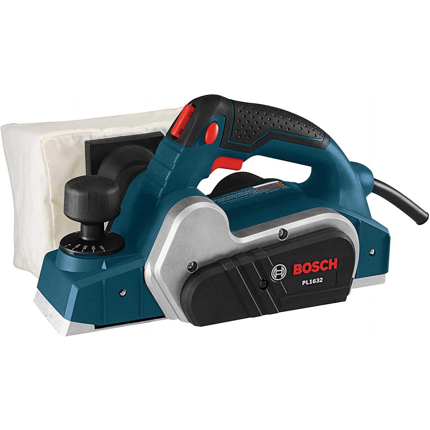 Bosch PL1632 6.5 Amp Hand Planer, 3-1/4″ – The PL1632 3-1/4-Inch 6.5 Amp Planer offers an industry-first planer lock-off/lock-on button that helps prevent accidental start-up and provides for extended operation. Dual-mount fence provides non-flexing guidance; prevents marring of door or workpiece face. Ball-joint cord swivel eases positioning of cord to keep it out of the way. Spring-loaded, built-in stand elevates tool to protect blade(s) and save money. Powerful 6.5 Amp motor with 16,500 RPM speed for fast stock removal. Includes: (1) 3-1/4-Inch 6.5 Amp Planer, (1) Reversible Woodrazor Blade, (1) Dual-Mount Guide Fence, (1) No Mar Plastic Overshoe for Fence, (1) Shavings Bag and (1) Blade Wrench.