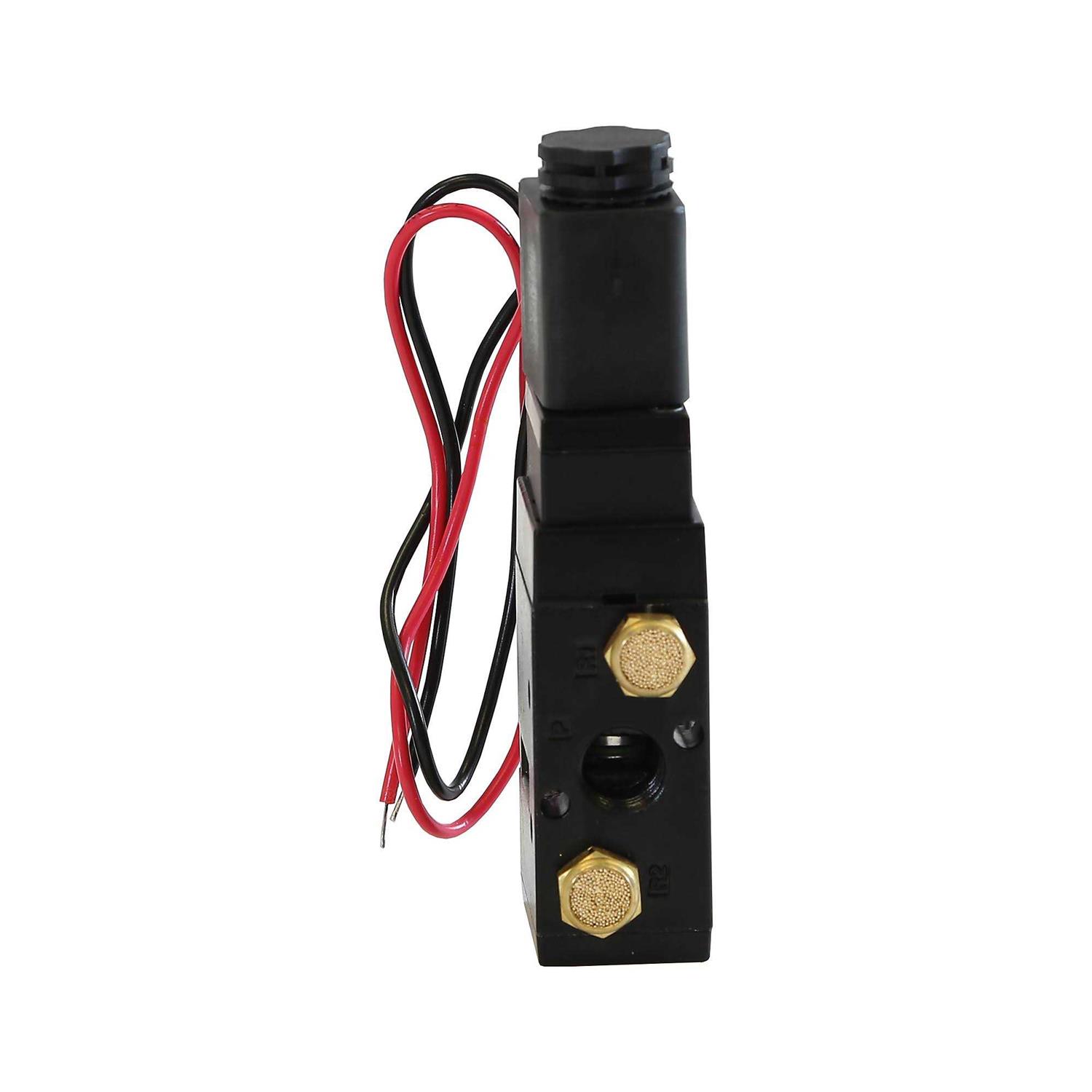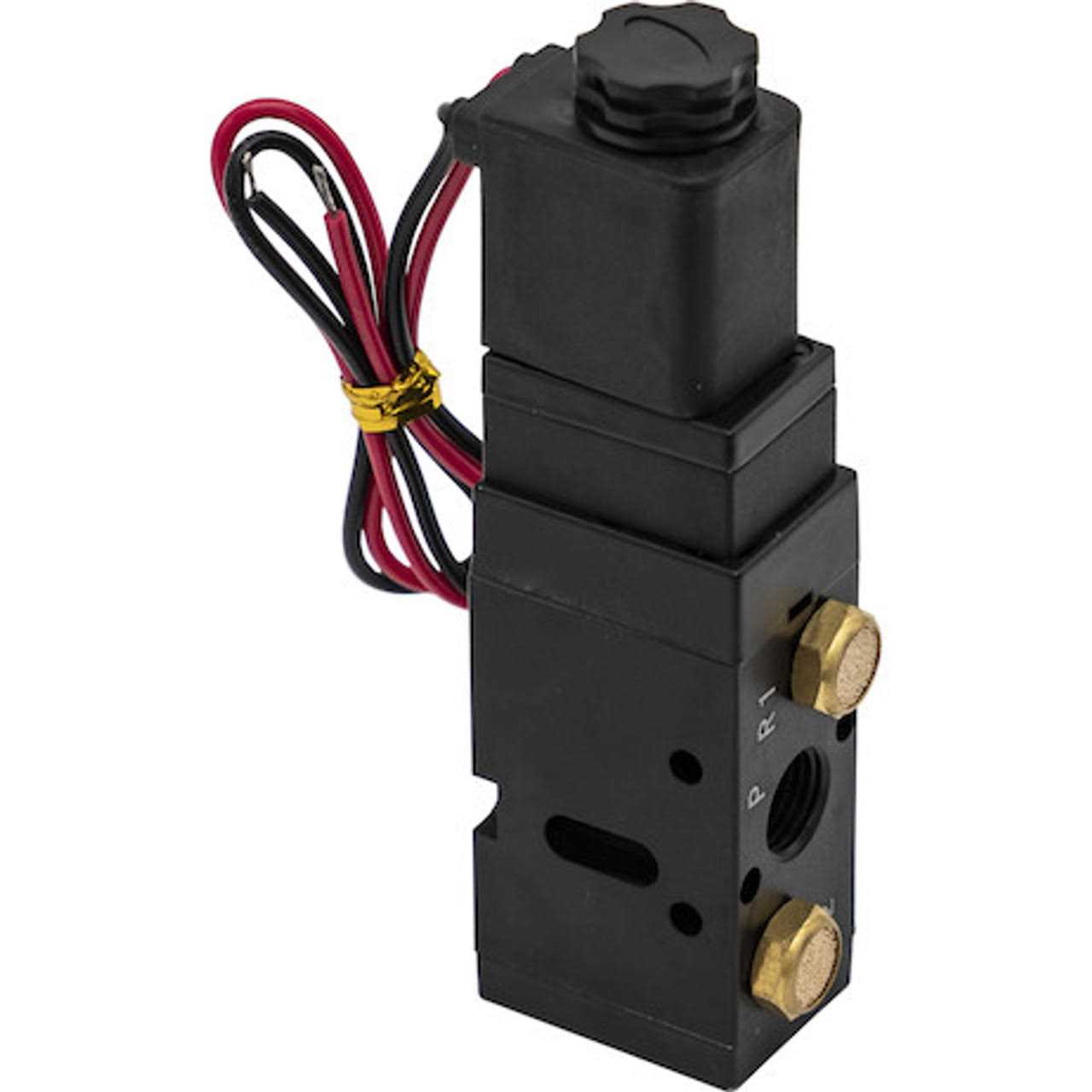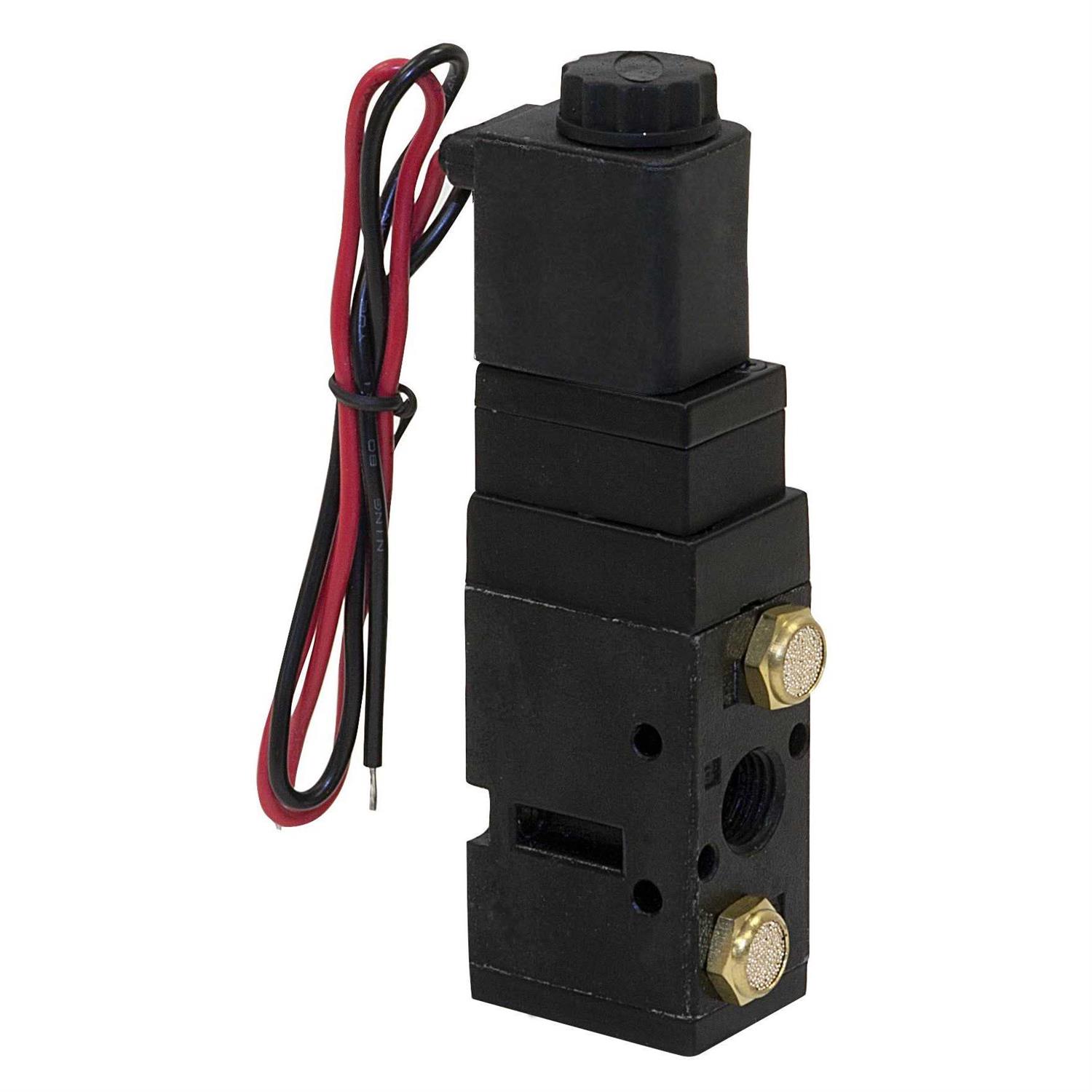 Buyers Products 4-Way, 2-Position Solenoid Air Valve controls the air flow required for precise operation in many air cylinder applications. It allows you to use or activate a pneumatic system remotely with an easy-to-install electronic switch. It has five standard 1/4 in. NPT ports for adequate air flow. The rugged 12V coil comes complete with 2 in. flying leads. While the valve is a standard 4-way, it can be easily converted to 3-way operation by installing two pipe plugs. Allows you to use or activate a pneumatic system remotely using an easy-to-install electronic switch. Easily converts to 3-way operation.