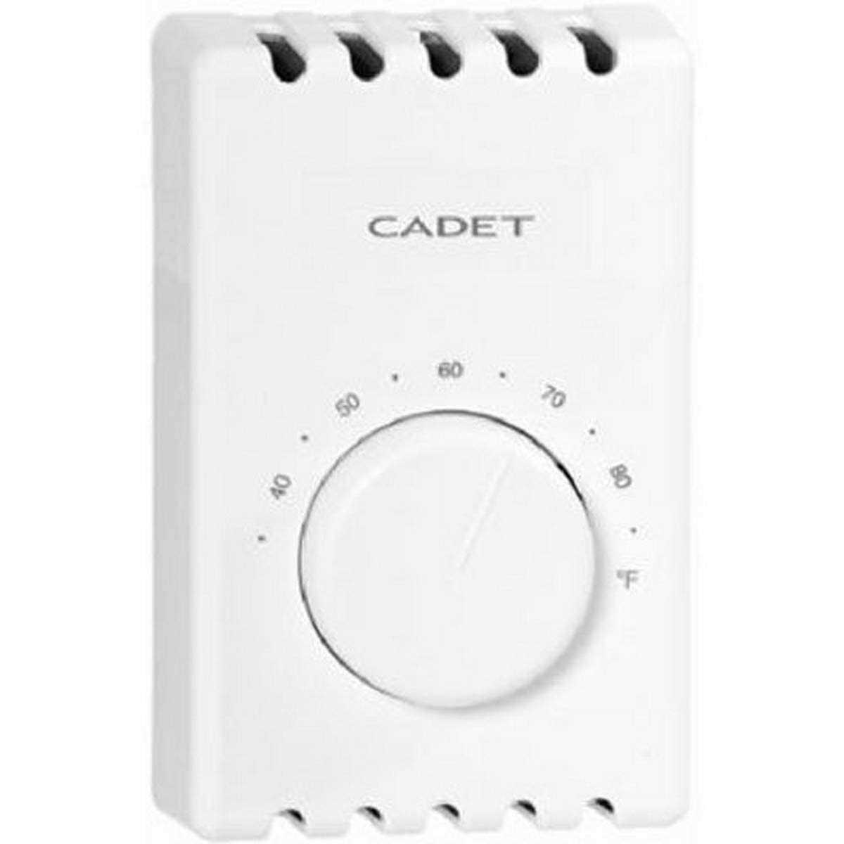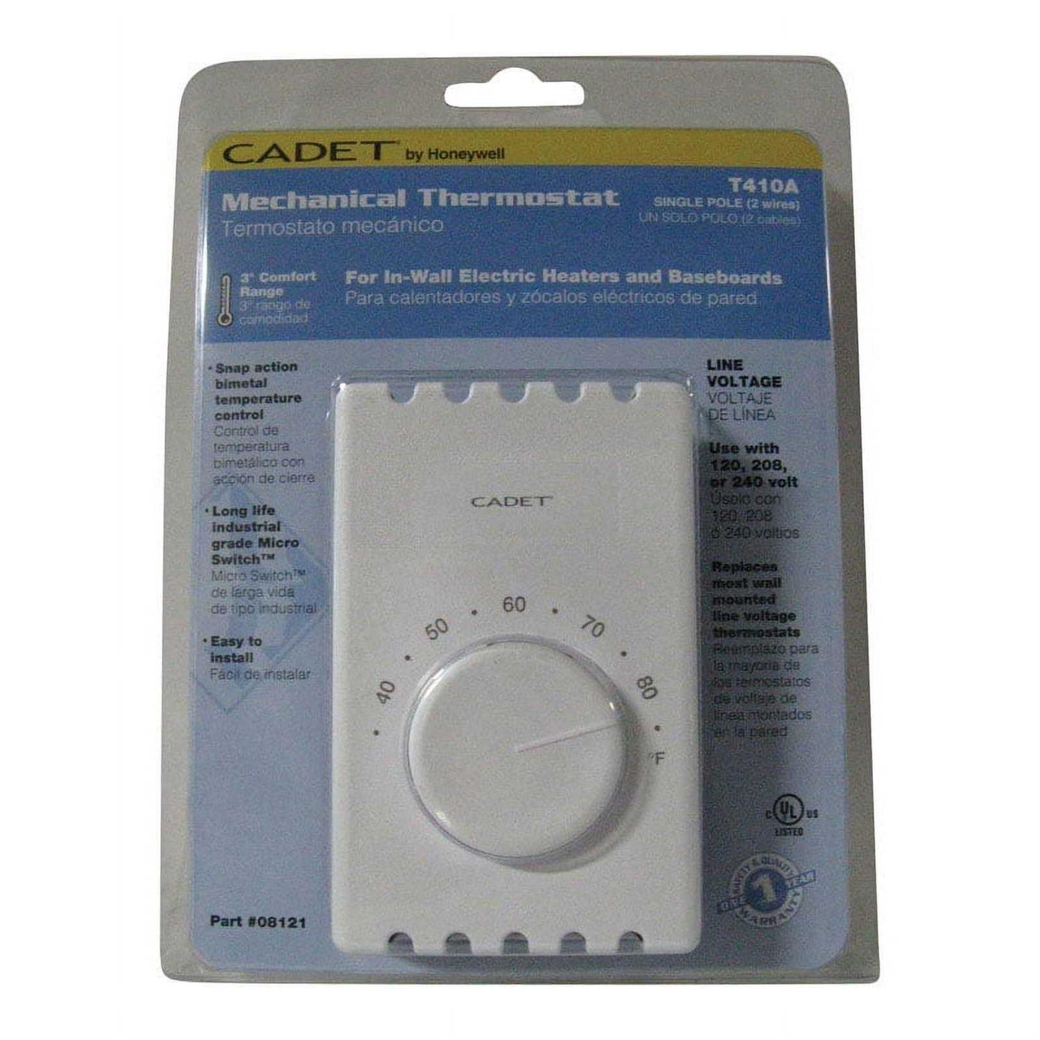 The Cadet by Honeywell T410 Bi-Metal wall mount thermostat is an economical choice for electric heaters and baseboards. Easy to install for new construction or replacement, rated at 22a. White, single pole (2 wires). Bi-metal wall mount thermostat replaces most wall-mount line voltage thermostats. Single Pole (2wire), 22 A Bimetal sensor with snap action switch Temperature range: 40 to 80 degrees Fits standard outlet box Includes cover lock and temperature range stops to govern min/max temperature setting White Additional discounts apply for this item when purchased as Bulk.