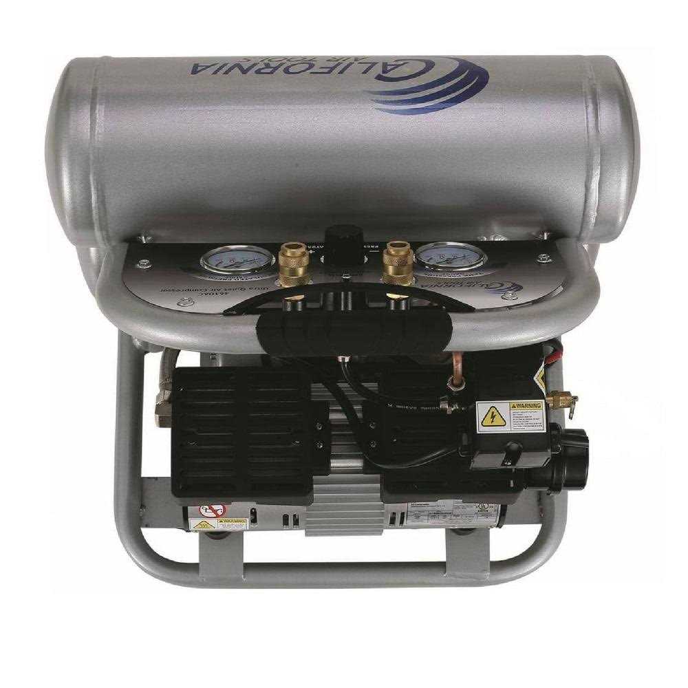 The California Air Tools 4610ACH Ultra Quiet and Oil-Free Air Compressor is designed to be one of the quietest air compressors in the industry having only 60 Decibels of sound. The powerful 1 HP (SP-9413) motor operates at only 1680 RPM creating less noise and less wear. The SP Series of Ultra Quiet Air Compressor Motors have been designed to increase duty cycle and allow for longer continuous run times. The Oil-Free Dual Piston Pump System is engineered for high performance and durability. The CAT-4610AC Air Compressor has a Oil-Free Dual Piston pump designed to have a life cycle before wear of 3000 Plus hours compared to other comparable air compressors with life cycles of 500 Hours or less. The Oil-Free pump allows for use in a variety of temperatures and uneven terrains. The 4.6 Gallon Aluminum (Rust-Free) Air Tank is Lightweight (44 lbs.) and very easy to transport. This air compressor is ideal for anyone working inside where noise is a major issue. Comes with a 25 ft. Industrial quick connectors.