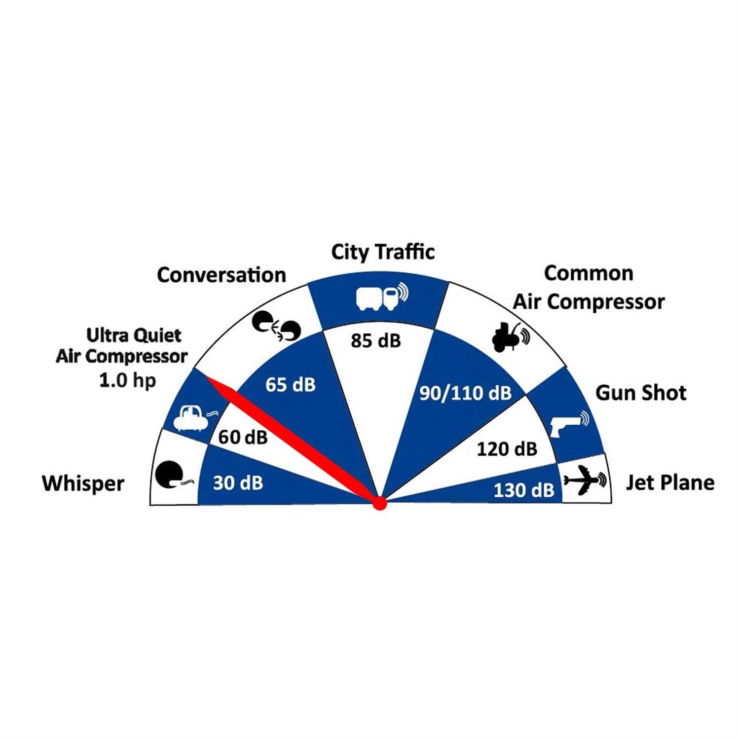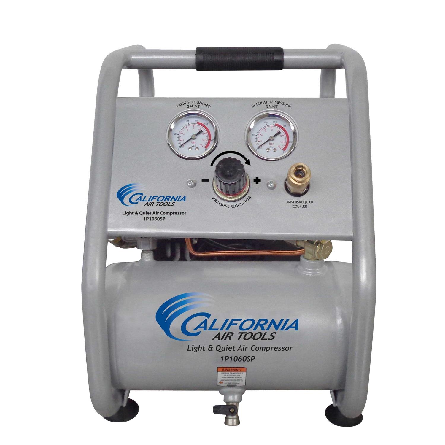 The California Air Tools light and quiet 1P1060SP portable air compressor is designed to be one of the quietest air compressors in the industry at only 56 db of sound. The 1.2 HP motor operates at only 1680 RPM, creating less noise and less wear. The updated in.Ip in. Ultra Quiet and oil-free motor is a single Piston pump design engineered for high performance and durability. The 1.0 GAL. Steel Air tank is lightweight (34 lbs.), making it very easy to transport. This compressor has an oil-free single Piston pump designed to have a life cycle before wear of 3000 Plus hours compared to other comparable air compressors with life cycles of 250 hours or less. The oil-free pump allows for use in a variety of different temperatures (cold) and uneven terrains. The 1P1060SP produces 1.2 CFM at 90 PSI, allowing you to use staple guns, brad nail guns, finish Nail guns, nail guns, airbrushes and blow guns. It’s great for the garage and perfect for cleaning or inflating tires, beds, toys and sport balls. Its quiet design is ideal for anyone working inside where noise is a major issue.