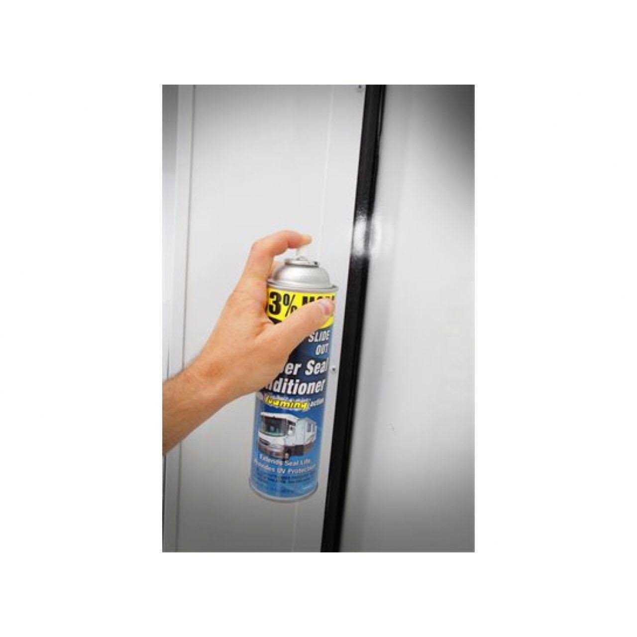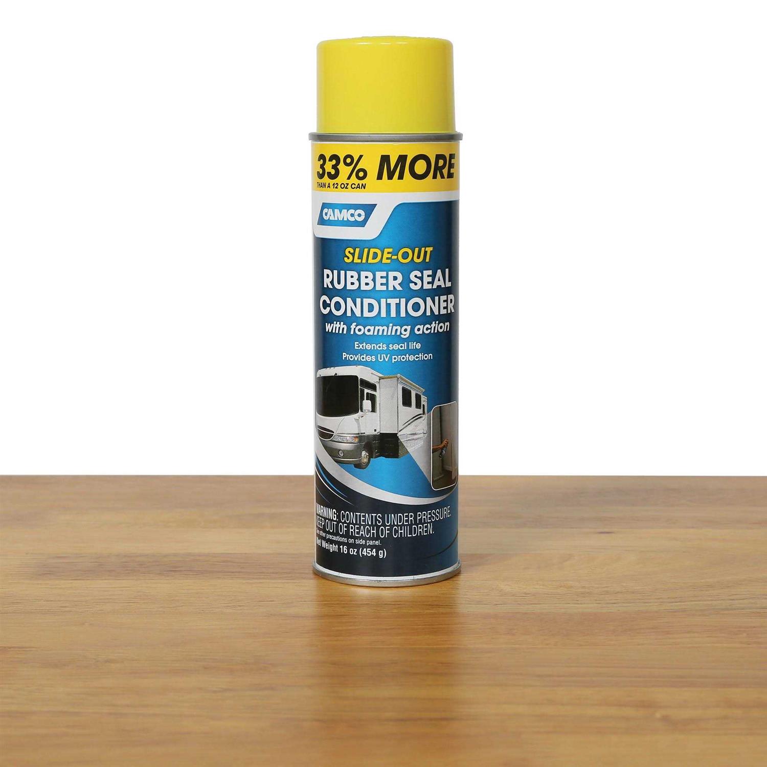 To prolong the life of rubber seals and prevent tearing and sticking, treat your RV’s slide out seals with Rubber Seal Conditioner. This foaming spray offers UV protection and resists corrosion. It comes in a 16 ounce can.