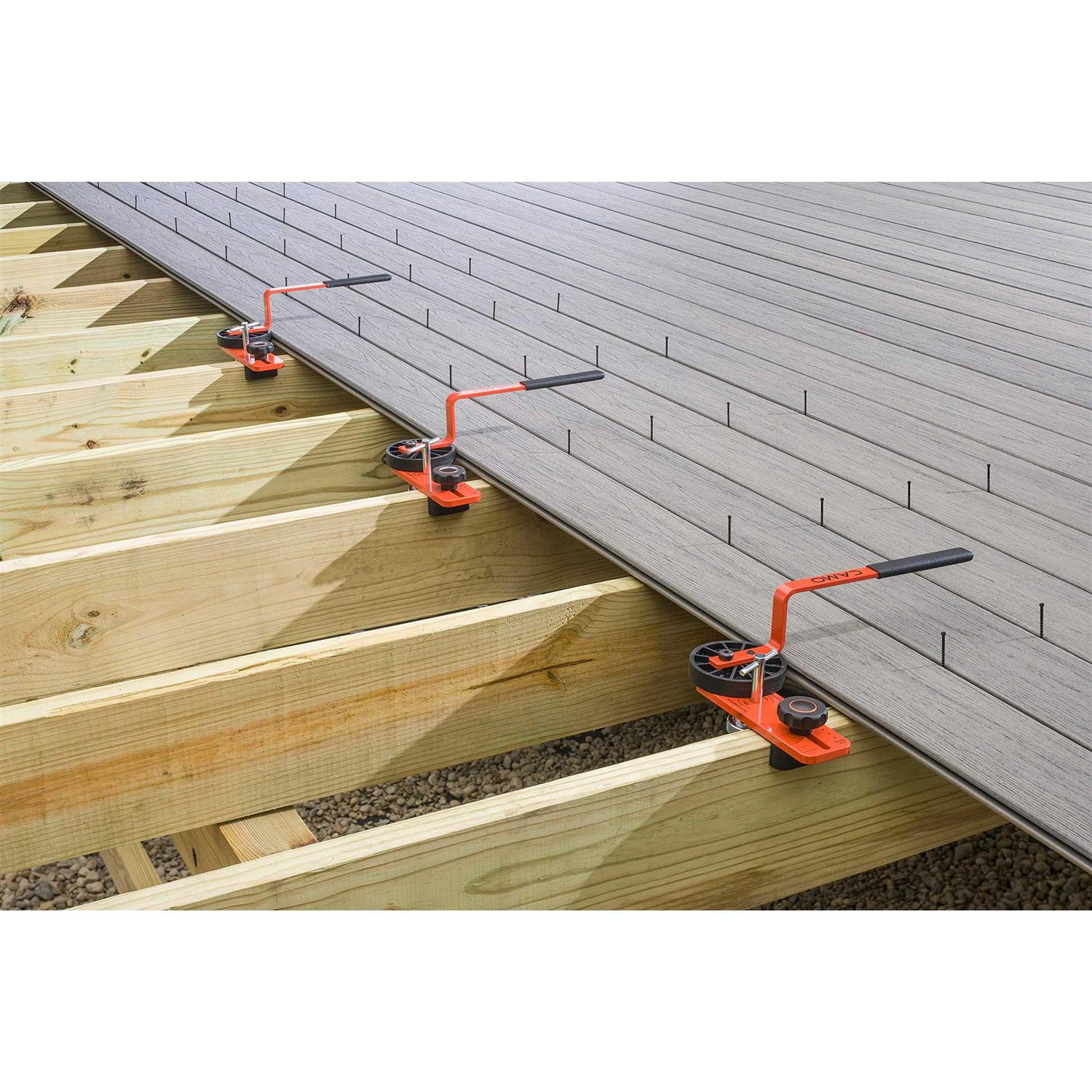 CAMO LEVER isn’t your average board bender. Why? Because it straightens warped boards effortlessly, and also locks-in rows of boards and clips, all while keeping spacing consistent. It’s the one-turn tool to build a better deck. No matter the board type—pressure treated, hardwood, composite, PVC—LEVER locks them all in place. Plus, it adjusts to single, double, and metal joists so you can use it for every install. Get more done with fewer crew members thanks to LEVER. Lay your boards down, set the tool on the joist, and lock them in, then you’re free to fasten. You can even build a deck by yourself.