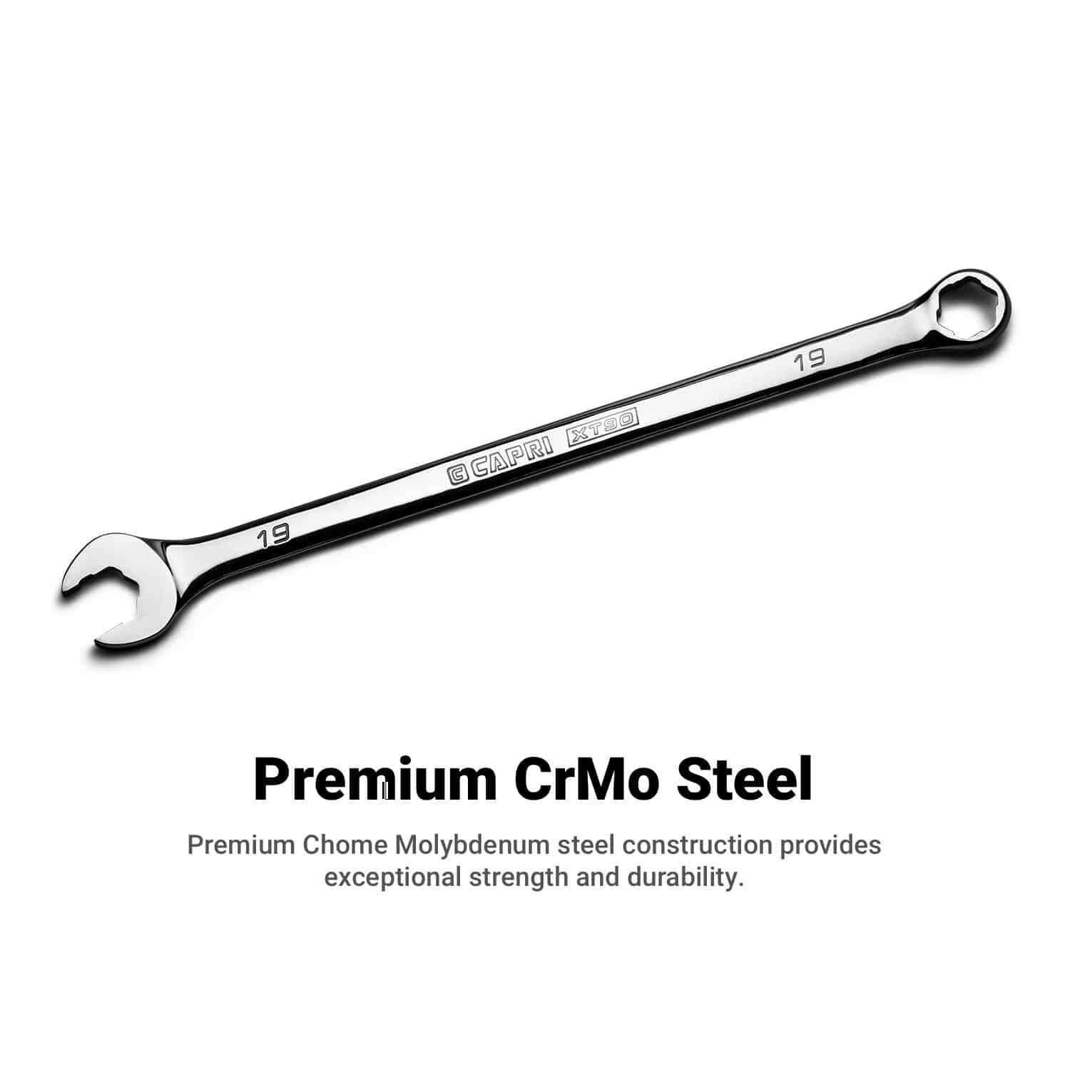 The Capri Tools XT90 Wave Drive Pro Combination Wrenches are a new generation of combination wrenches that lets you tackle bolts in virtually any condition. Wave Drive Pro open end (3-point) and box end (6-point) give you a sure grip and satisfying turns on both unrounded and rounded bolts. Wave Drive Pro also prevents damaging and rounding of unrounded bolts. Made with premium Chrome Molybdenum steel which provides exceptional strength and durability. Our Max Chrome plating requires each wrench to be impeccably polished and finished with careful application of chrome protective plating. It ensures durability and corrosion resistance.