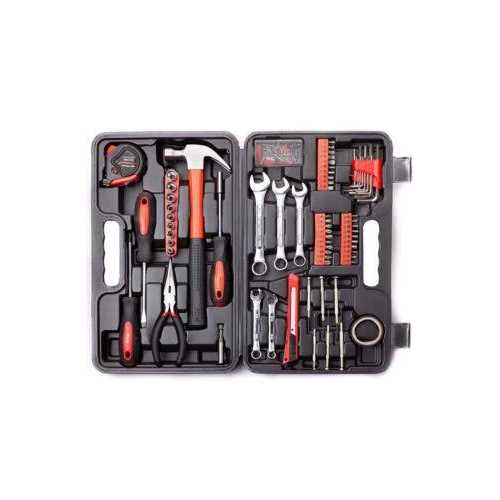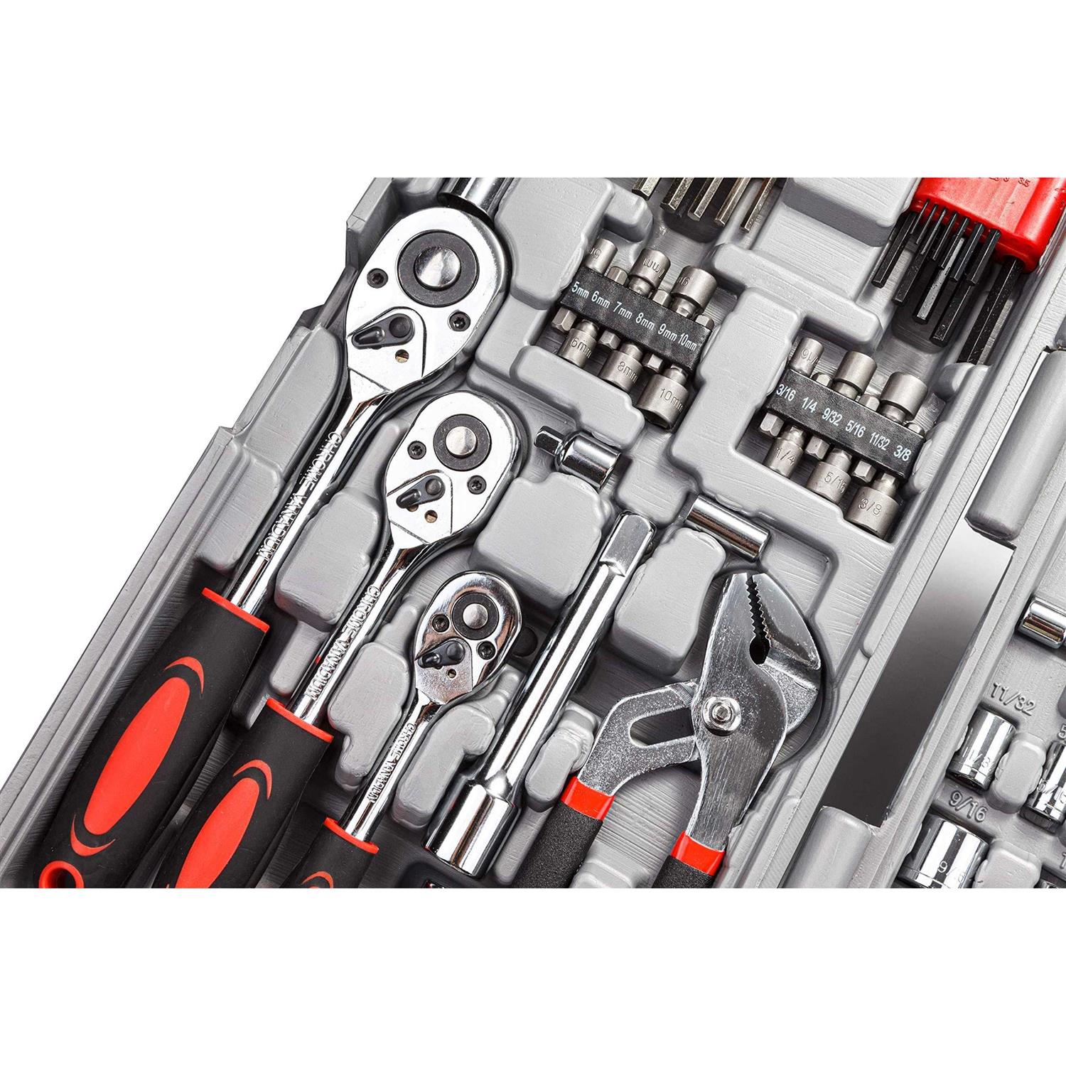 Cartman Tool Set 205Pcs Red Ratchet Wrench with Sockets Kit Set in Plastic Toolbox 205 pieces basic tool set for household repair and car repair, nearly includs most tools for DIY-er, repairmen, construction workers, mechanics and etc Forged from high-quality steel and finished in high-polish chrome,strength, durability, anti-corrosion protection Comprehensive assortment of professional-grade wrenches, ratchets, a complete range of 1/4 inch and 3/8inch metric-sized sockets and precision screwdriver, hammer, pliers, wrench,and etc. Easy to carry& storage. Housed in a handy blow-molded case for easy tool storage and portability. Its sturdy interior and organizer keeps tools in place All tools meet or exceed ANSI critical standards. Perfect Christmas Gift Guide- for household and car repair, nearly includes most tools for DIYer, repairman, construction workers, mechanics and etc. Forged from high-quality steel and finished in high-polish chrome,strength, durability, anti-corrosion protection. All tools meet or exceed critical standards.
