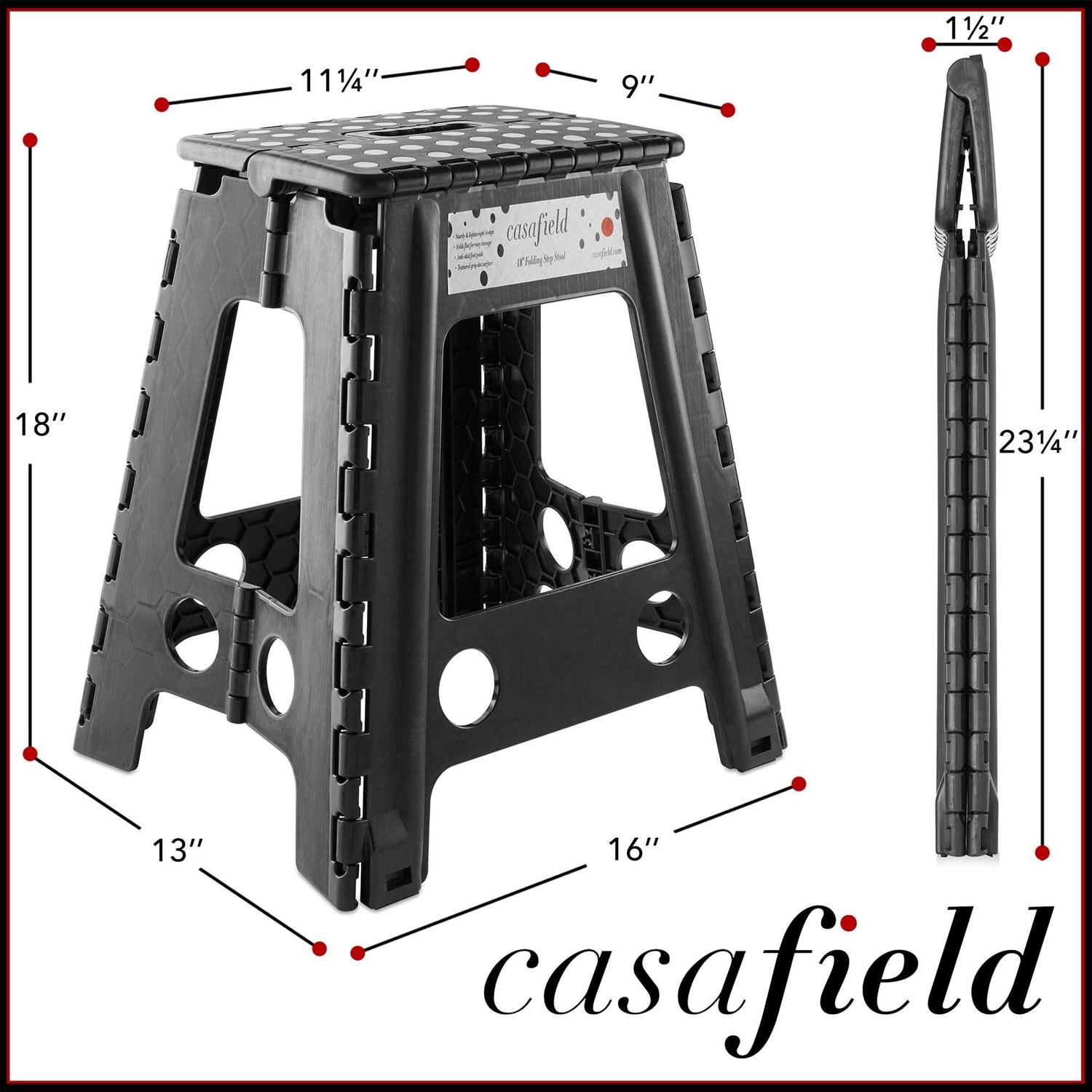 Never struggle again with out-of-reach items with this lightweight yet sturdy folding step stool from Casafield. This convenient, easily portable stool easily opens with the flip of only one hand, providing 18 inches of height when needed. Designed with safety in mind, this stool features a textured, grip-dot, no-slip step surface for secure and safe use, as well as anti-skid foot-pads. Safety certified, this stool is perfect for everyone, including kids. Take this stool with you, the convenient handle allows you to easily transport it from room to room, or on-the-go. Keep a stool in the kitchen, bathroom, closet, RV, dorm, and anywhere you might need a stool for hard-to-reach areas. Casafield is an industry leader in affordable home accessories and organizational solutions perfect for any style and budget. To Use: Open completely to the locked position. Wear slip resistant shoes and stand with both feet on the stool. Be sure to keep weight evenly distributed while standing on stool.