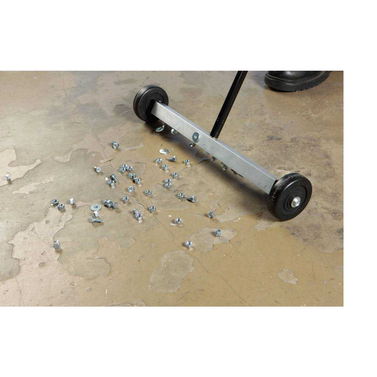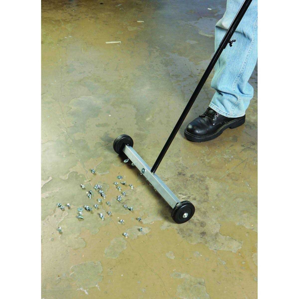 Picks up nails, tacks, screws, bolts, nuts, clips and more 40 in. long handle with formed PVC grip Two 3 in. diameter x 3/4 in. wide wheels Magnetic Floor Sweeper has Hanger hole for easy storage This Magnetic Floor Sweeper is ideal for homes, shops, garages, warehouses or yards, this amazing mini magnetic sweeper picks up nails, tacks, screws, bolts, nuts, clips and more easily! Just roll the magnetic base over the floor area and let the magnetic roller do the rest! The magnetic sweeper features a 40” long handle with formed PVC grip and hanger hole for convenient storage when not in use.