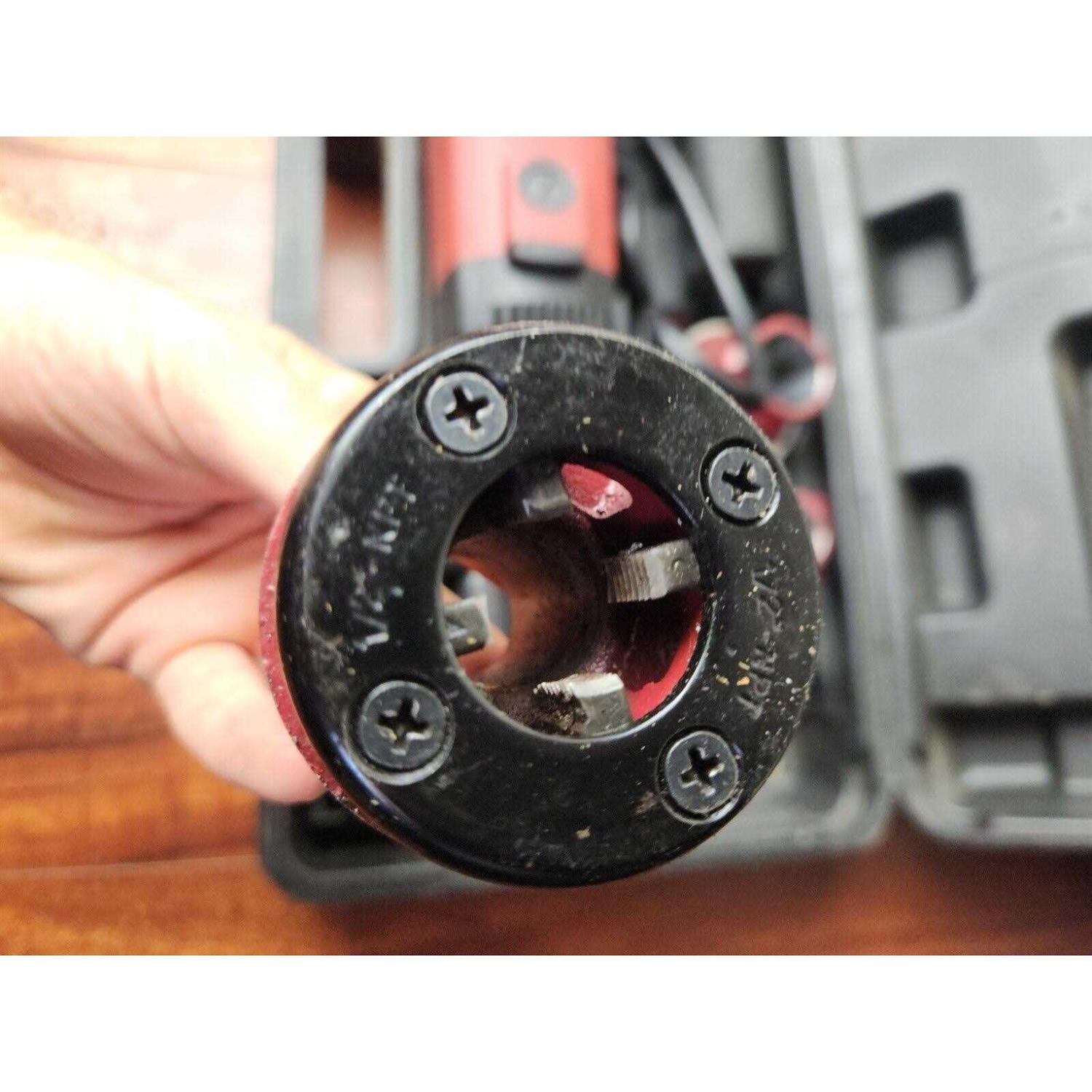 Save time and hand strain with the portable electric pipe threader that comes with these (4) dies. The pipe threader also features a sturdy die cast aluminum housing, easy access to the carbon brushes and a paddle switch that shuts off automatically.