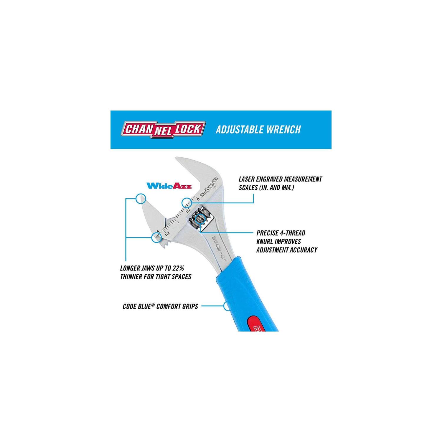 Channellock WideAzz has the capacity of a 12 inch wrench in an 8 inch package. Longer jaws grip better avoiding slippage or nut roundoff. Greater jaw capacity supports larger nuts and bolts. Thinner jaws for easier access in tight spaces. Four thread knurl and non-protruding jaws provide ease of operation and greater capacity. Longer jaws grip better Greater jaw capacity supports larger nuts and bolts Thinner jaws for greater access in tight spaces Precise jaw design Capacity of a 12 inch wrench Additional discounts apply for this item when purchased as Bulk.