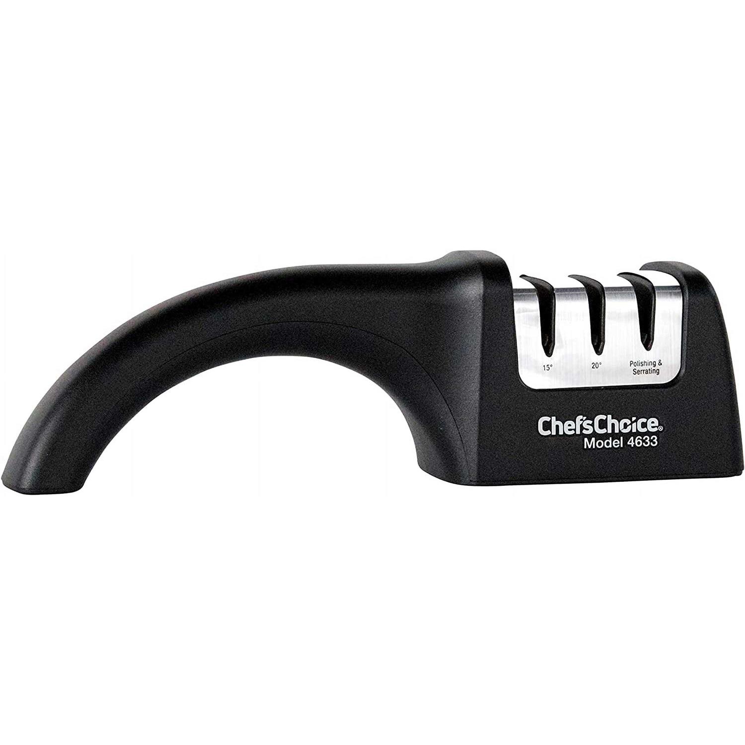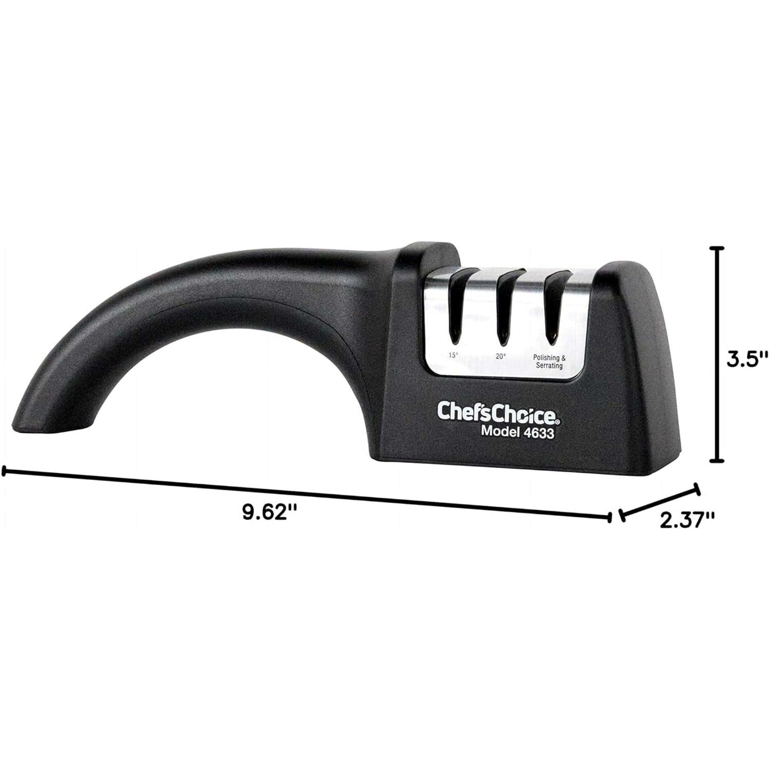 Chef’sChoice angle select diamond hone knife sharpener no.4633 can be used for euro-american/Santoku/serrated knives. Elegantly-styled with a compact footprint, this professional manual 3-stage sharpener applies a super sharp edge on all quality knives including straight edge kitchen and household knives, Santoku knives, sports and pocket knives and serrated knives. It will quickly and easily restore the traditional 20 Degree edge on European and American style Knives and a 15 Degree edge for Asian style Knives. Using 100-percent diamond abrasives, precise angle control and an advanced sharpening system, it creates a super sharp, double beveled edge that is stronger and more Durable. The Angle Select M4633 sharpens the entire blade length, from tip to bolster, with no guesswork. Featuring an ergonomic handle to fit all hands, it can be used right or left-handed. The slip resistant rubber feet hold fast to the work surface. 3-stage manual sharpener for super sharp edges on all your knives European/ American and Asian Style knives -15 degree and 20 degree class.,Perfect for Kitchen /Household knives straight or serrated, Santoku, Sports and Pocket Knives,100% diamond abrasives in stages 1, 2 and Sharpening technology creates double beveled edges that last longer.,Sharpens the entire blade length, from tip to bolster. Sharpens straight edge and serrated knives.,Easy to use, right or left-handed. Slip resistant rubber feet hold fast to the work surface.