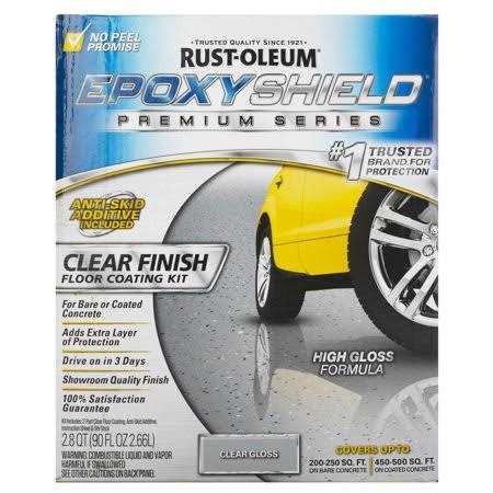 Rust-Oleum EPOXYShield Premium Clear Coating adds a high-gloss protective finish to coated or bare concrete surfaces. Apply for excellent wear, impact and abrasion resistance to heavy foot and vehicle traffic. Kit includes 2-part solvent-based epoxy coating, anti-skid additive, stir stick and detailed instructions.