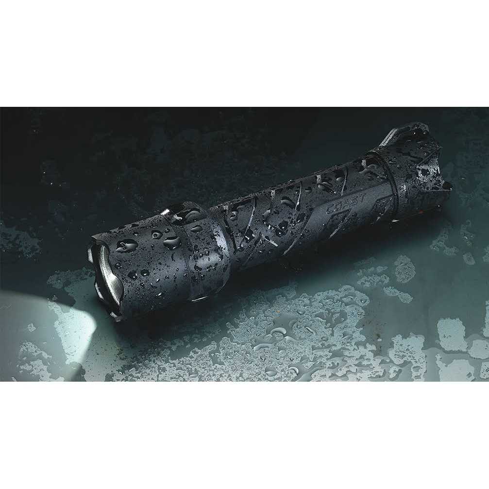 Coast designed and built the PolySteel 600 LED Flashlight to work as hard as you and be just as tough. With a twist of a collar on the head, the versatile Pure Beam Focusing system allows you to change the beam from a wide flood that lights large areas close to you into a focused spotlight that is optimized for a long throw. In the spot mode, the light has Coast’s bulls-eye beam that has a bright center circle that smoothly transitions to a dimmer “halo” around it—providing maximum illumination where you need it with plenty of spill to keep you aware of your surroundings. The PolySteel body consists of a stainless steel core wrapped in a nylon-reinforced polycarbonate material. This combination of poly and steel produces a housing that is resistant to drops, impacts, and crushing. The poly exterior is highly slip resistant, and the deep-grooved handle design adds to its positive grip even in cold and wet conditions. Speaking of wet conditions, the PolySteel 600 is rated IP54 water resistant, so the occasional splash or spray will have no impact on its performance. The PolySteel 600 runs on four AA batteries and its three outputs are controlled using a simple push-button tailcap switch. With a mid-sized length and weight, and powerful high-lumen output, the light is up to just about any daily task you give it—making it your ideal everyday carry illumination tool.