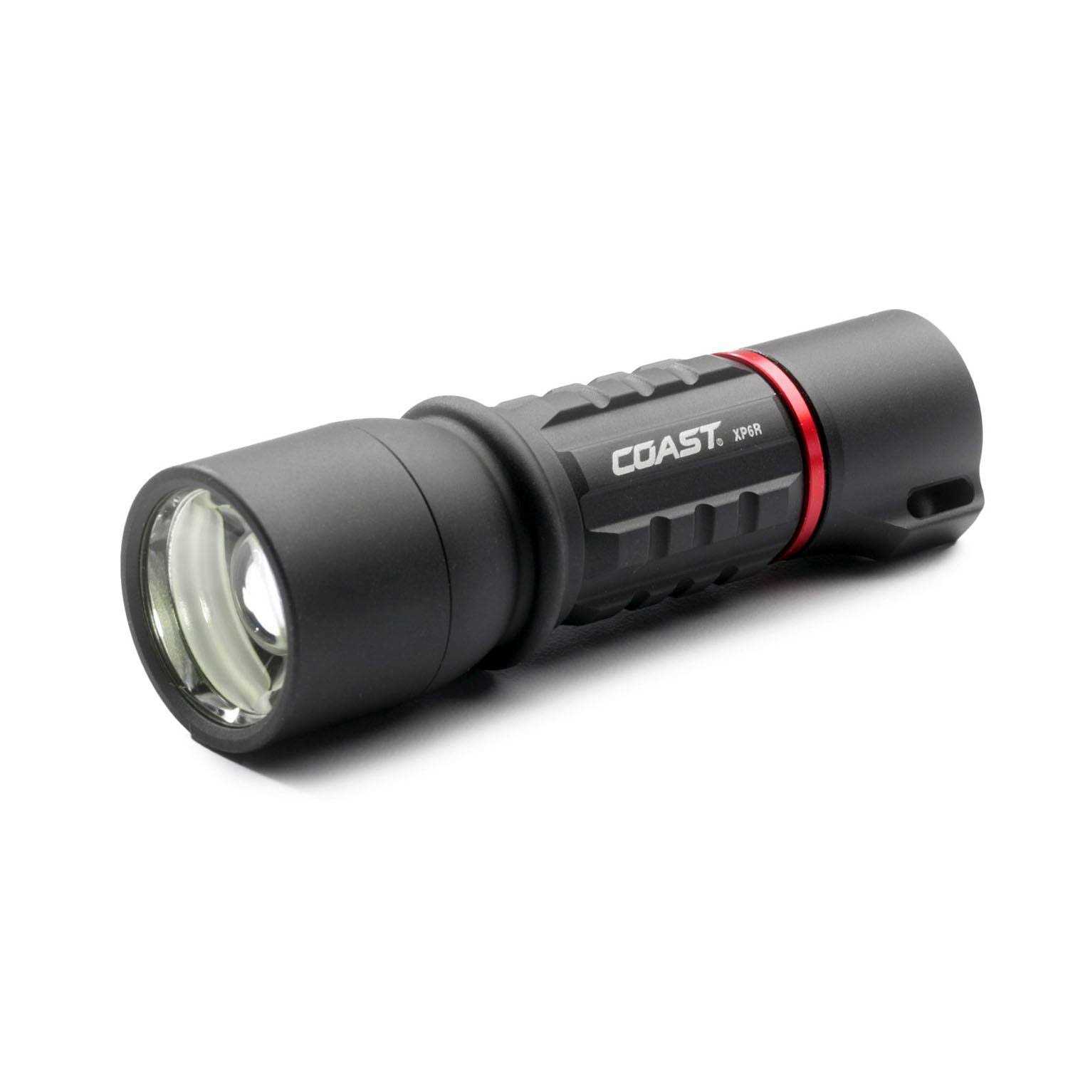 COAST XP6R Overview 1Description 2Light Performance 3Switching 4Construction Details The Coast XP6R Rechargeable LED Flashlight is a tiny powerhouse, measuring just 3.5″ yet delivering a bright 400 lumens peak output in flood and spot modes. The XP6R uses Coast’s Slide Focus mechanism, which makes it easy to alternate between the Ultra View flood beam and Bulls-Eye spot beam. The LED emits 35, 150, or 400 lumens, with runtimes on the rechargeable Zithion-X battery of 10, 5, and 1.9 hours, respectively. In the event that recharging isn’t an option, the XP6R can also run on one CR123A battery. Use of them does not imply any affiliation with or endorsement by them.