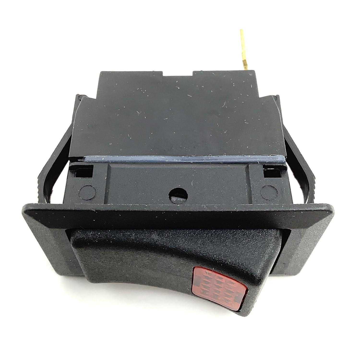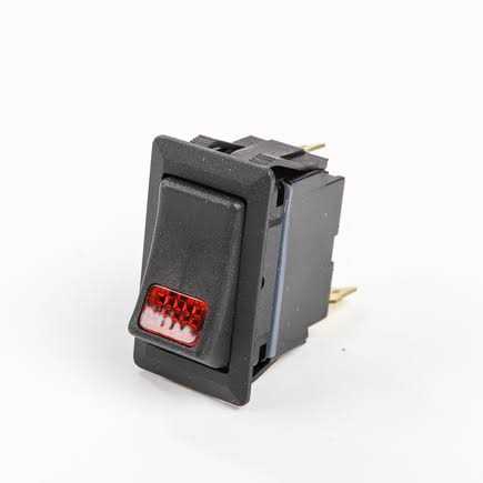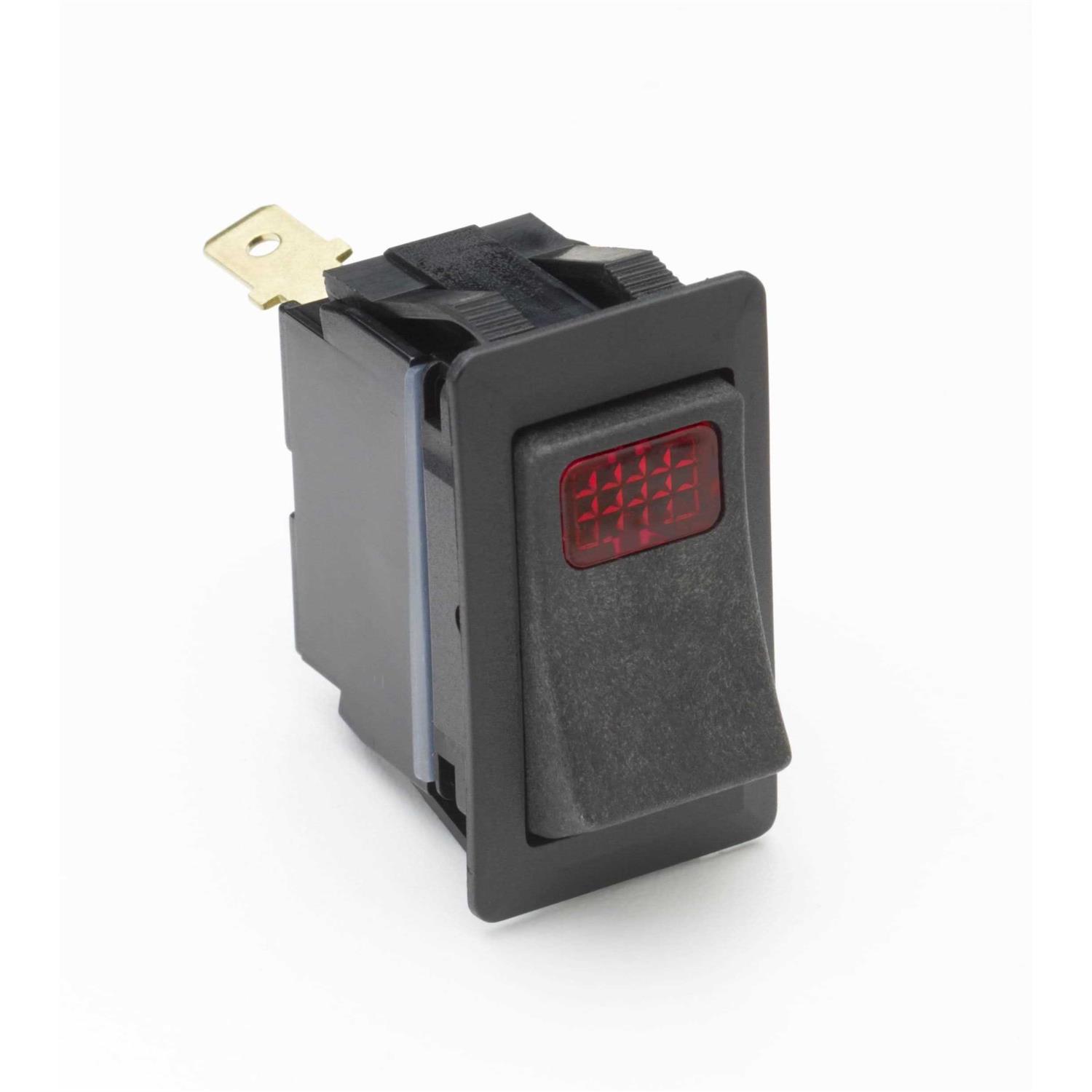 Toggle by Cole Hersee. Details:25A at 12V DC. incandescent. These general purpose switches are suitable for many kinds of applications. They are weather-resistant with contact areas sealed to IP66 (high pressure wash resistant). Switches snap into standard rocker switch holes 1.45-Inch x 0.08-Inch (36.8 x 21.1mm) in panels from 0.09-Inch to 0.19-Inch thick (2.4 x 4.7mm). Pilot lights are independent or dependent, as noted. They have silver contacts, which give superior switching performance. Housing is matte black. Single pole, Single throw, with dependent illumination. Three blade terminals. Red lens.