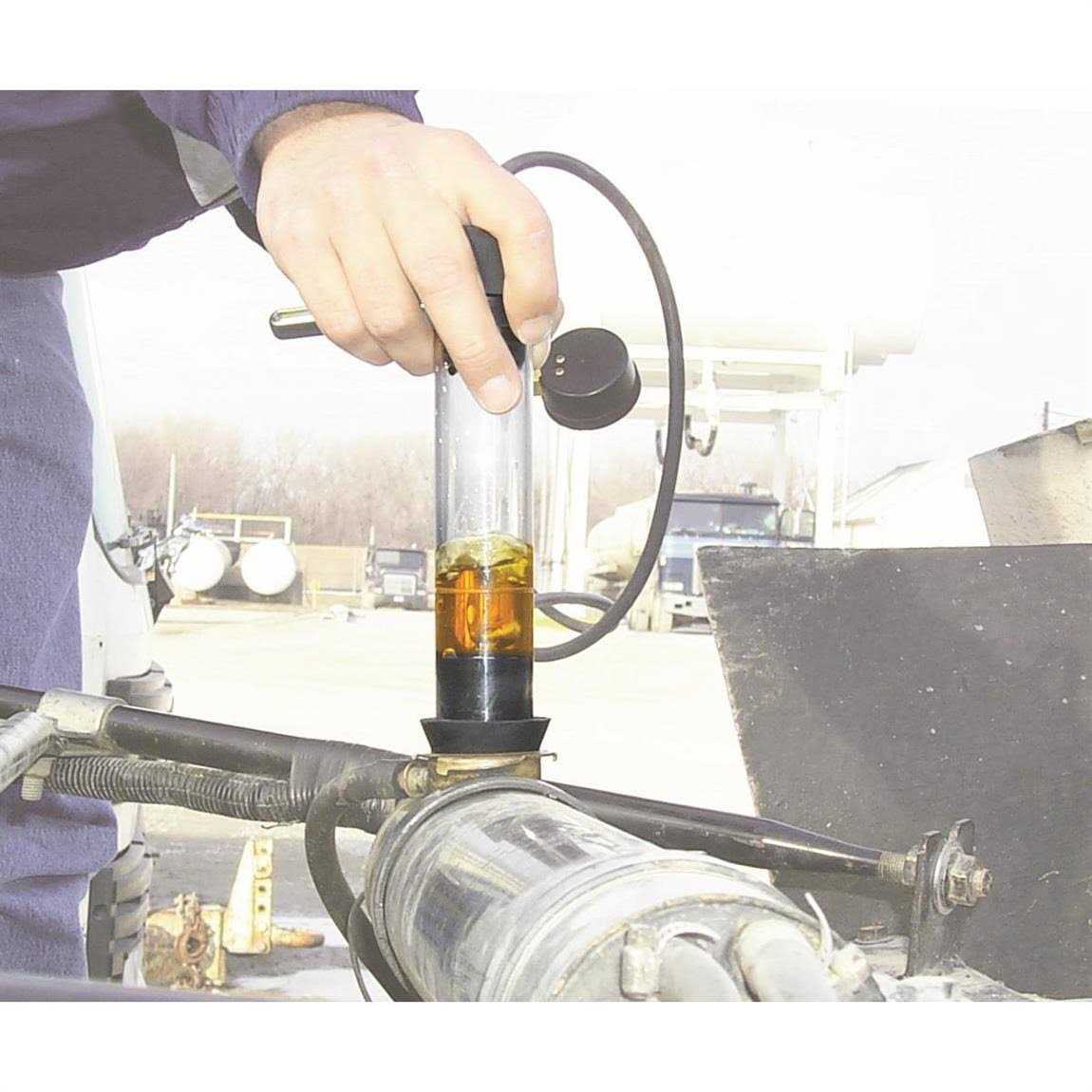 Indicating fluid changes from blue to yellow when exposed to combustion gases in the radiator. Connect the hose to any vehicle vacuum line. Place tapered end of tool into radiator opening after draining of some coolant. With the engine running, the vehicle’s vacuum draws vapors through the indicating fluid for testing. Checks for combustion leaks caused by bad head gaskets, cracked blocks, and cracked or warped heads Fluid changes from blue to yellow when exposed to combustion gases from the radiator With the engine running, the vehicle vacuum or the vacuum pump draws vapors through the indicating fluid for testing Product descriptionChecks for combustion leaks caused by bad head gaskets, cracked blocks, and cracked or warped heads. Fluid changes from blue to yellow when exposed to combustion gases from the radiator. Connect the hose to any vehicle vacuum line. Or, on tools made after June 2002, use the red adapter with a hand vacuum pump. Place tapered end of tool into radiator opening. With the engine running, the vehicle vacuum or the vacuum pump draws vapors through the indicating fluid for testing.