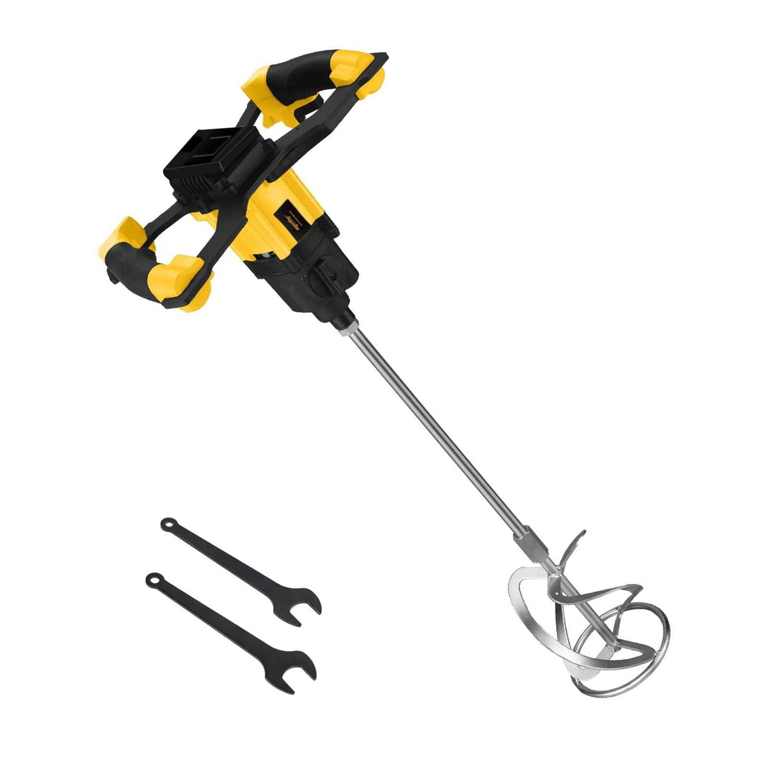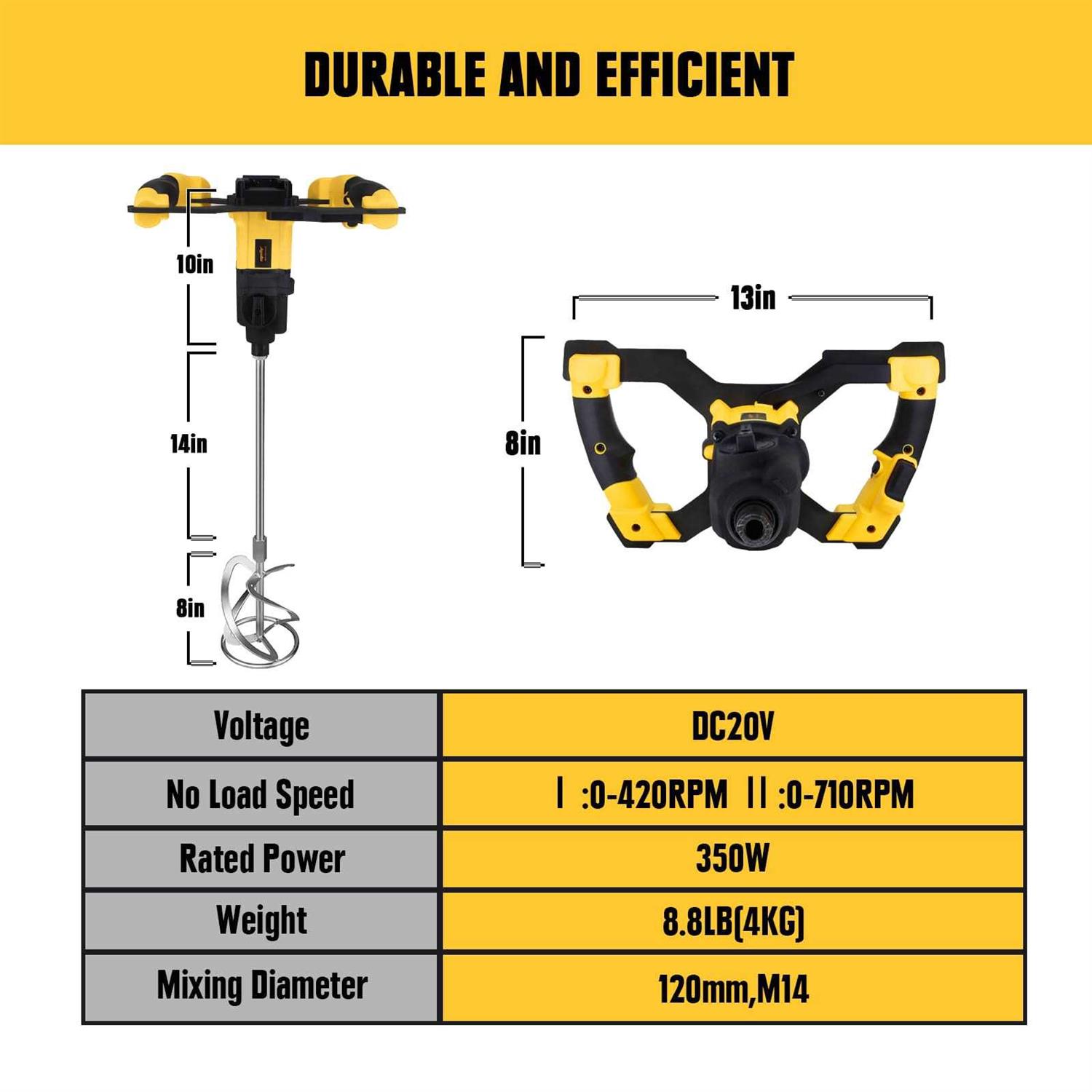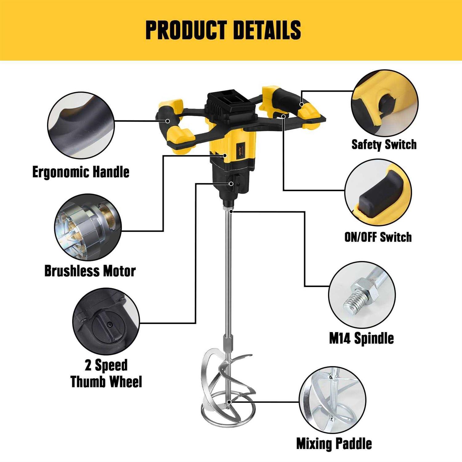 The power cement mixer is designed for Dewalt 20V Max batteries (Battery NOT Included). It has a 2-speed option (0-420RPM and 0-710RPM) for versatile mixing. Safety is ensured with overheat protection, and it features an ergonomic dual-handle design. The Handheld mud mixer works with various materials, such as cement, mud, paint, plaster, and putty.