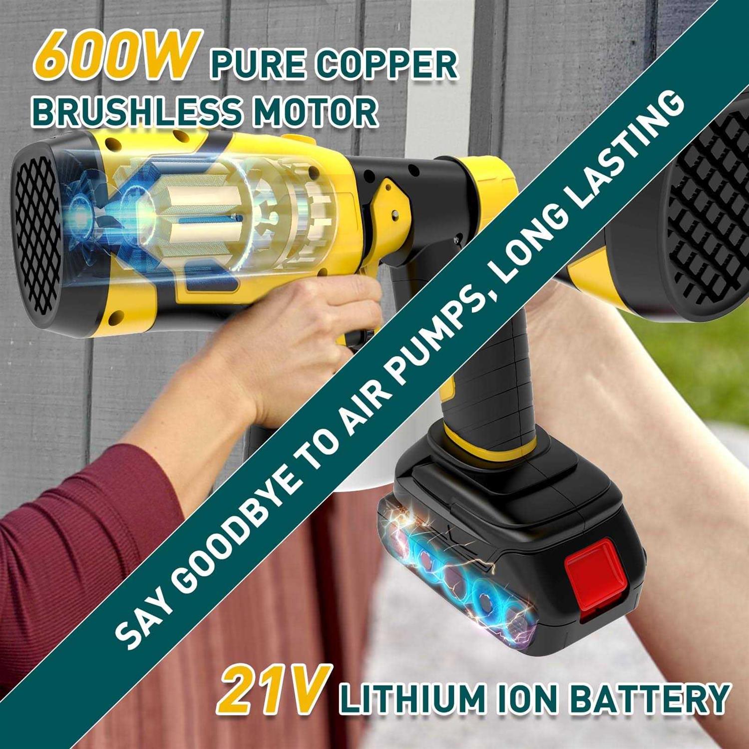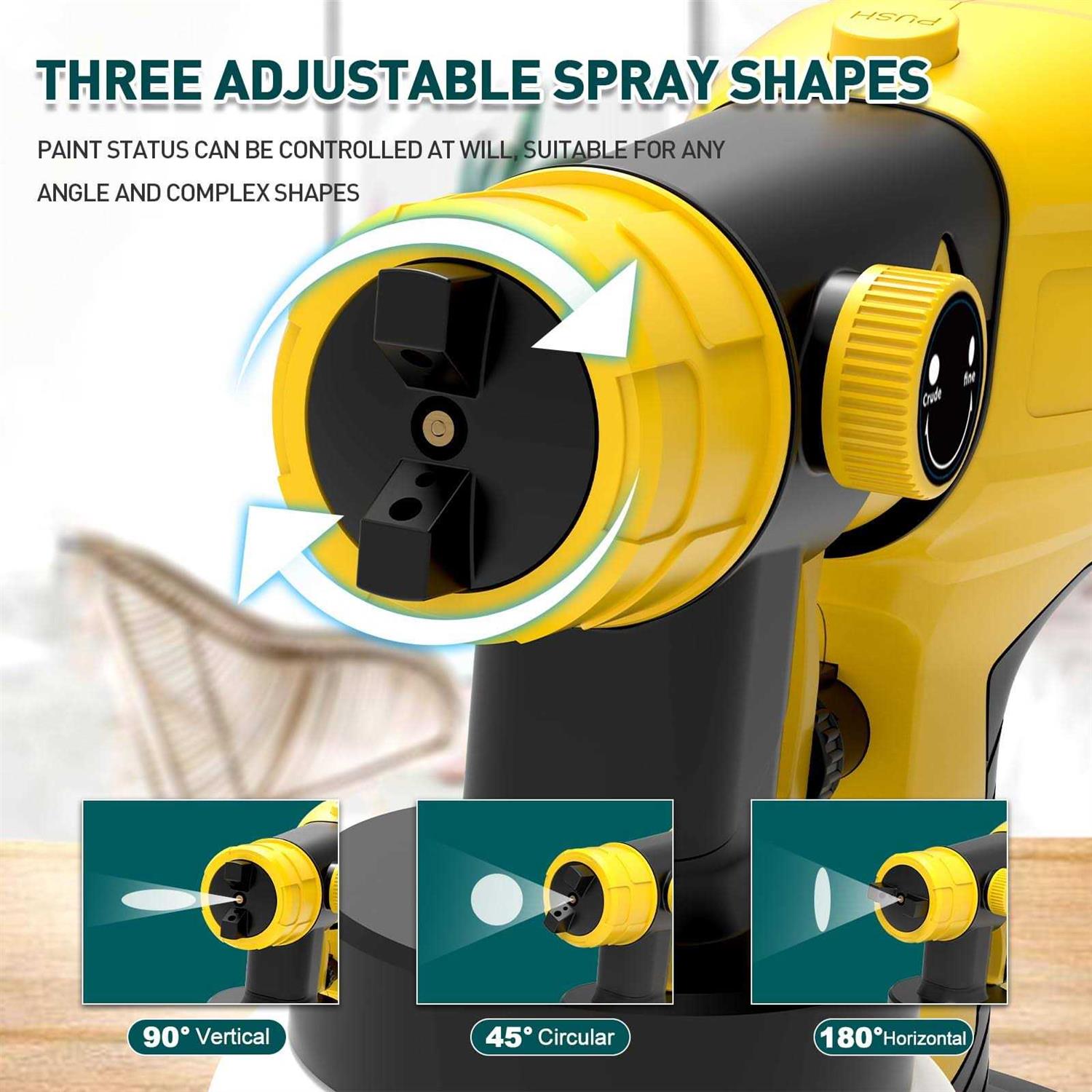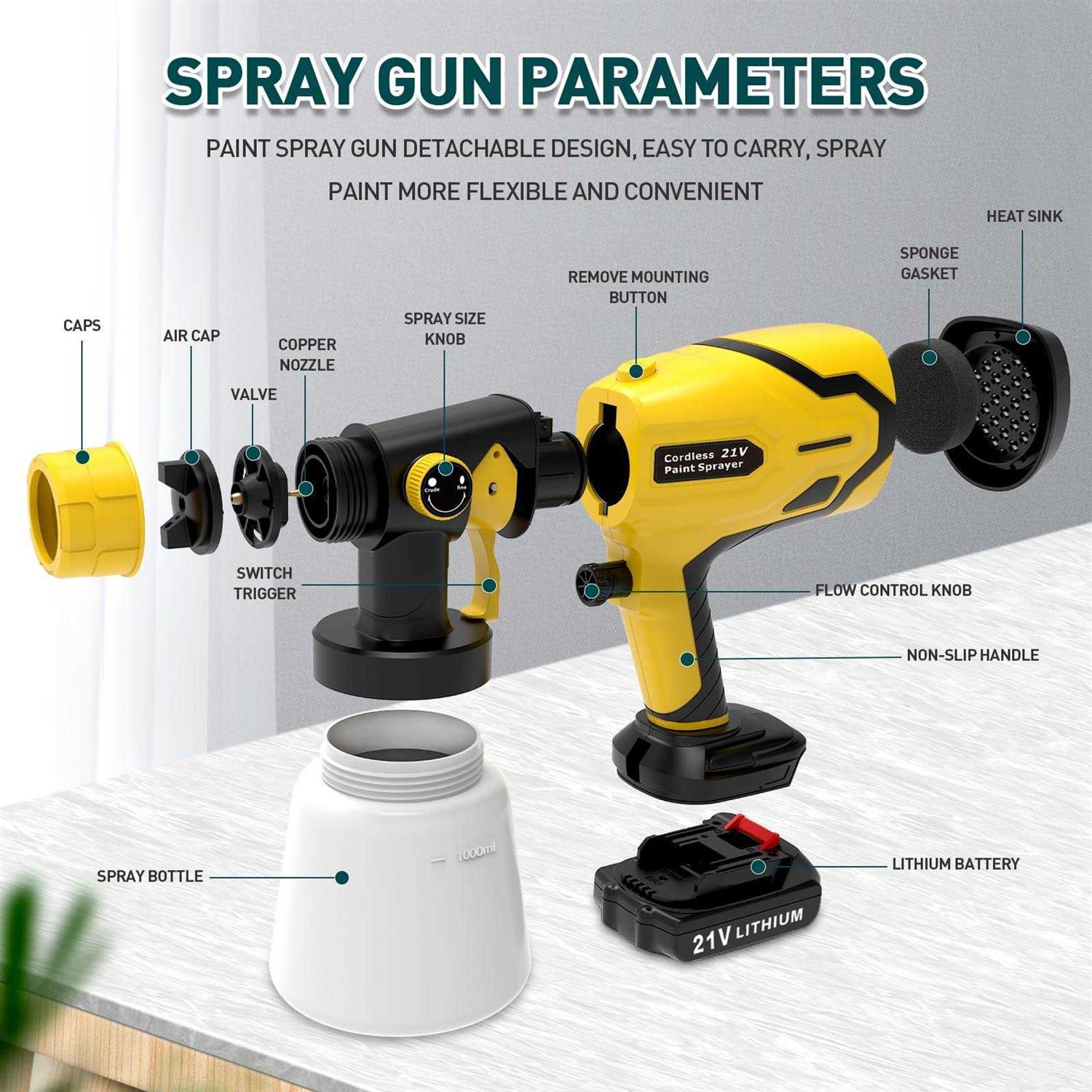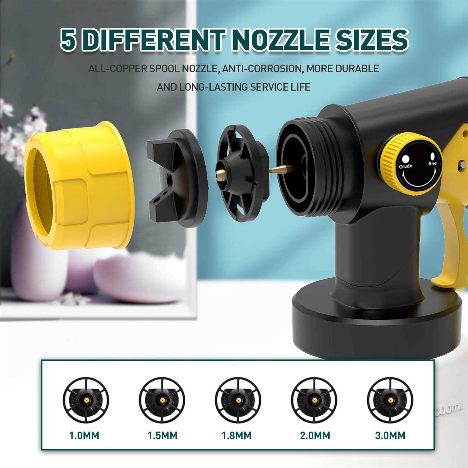 【Stay Away From Entangled Wires】Cordless design allows you to get rid of the traditional power cord limitations, the cordless paint sprayer comes with 2 x 2000mAh batteries and 1000ml container, so you can work for a long time without an outlet. Perfect for paint sprayers for home interior and exterior. 【High Speed Brushless Motor】The battery operated paint sprayer equipped with a 600w high power brushless motor that can handle viscosities up to 40 DINs, hvlp spray gun equipped with a 2000mAh high capacity battery, Mainly used for paint sprayers for home interior and exterior, such as walls, furniture, decks, fences, DIY etc. (Best spray distance: 10-16inch) 【3 Patterns & 5 Size Copper Nozzles】The electric paint spray gun has 3 different spray modes. Vertical, horizontal and round spray modes are easily achieved by adjusting the air cap lugs. You can also control the amount of paint output by adjusting the flow control knob. It is also equipped with 5 types of nozzles of 1.0 1.5 1.8 2.0 and 3.0 mm, which can be freely changed according to the usage requirements. 【Easy to Use & Clean】The paint spray gun is lightweight and easy to use because of its one-key operation mounting and dismounting design. When you have completed your painting job, you will need to remove the motor parts and battery, then soak other parts in water to clean, after each use, please clean the nozzle with the needle immediately to prevent clogging the liquid outlet. 【Packing List】The paint sprayer set include: 1 X Electric Paint Sprayer, 5 X Copper Nozzles, 2 X 2000mAh Batteries, 1 X 1000ml container, 5 X Paint Filters, 1 X Viscosity Cup, 2 X Cleaning Brush, 1 X Cleaning Needle, 1X Gloves, 1 X Glasses, 1 X User Manual.