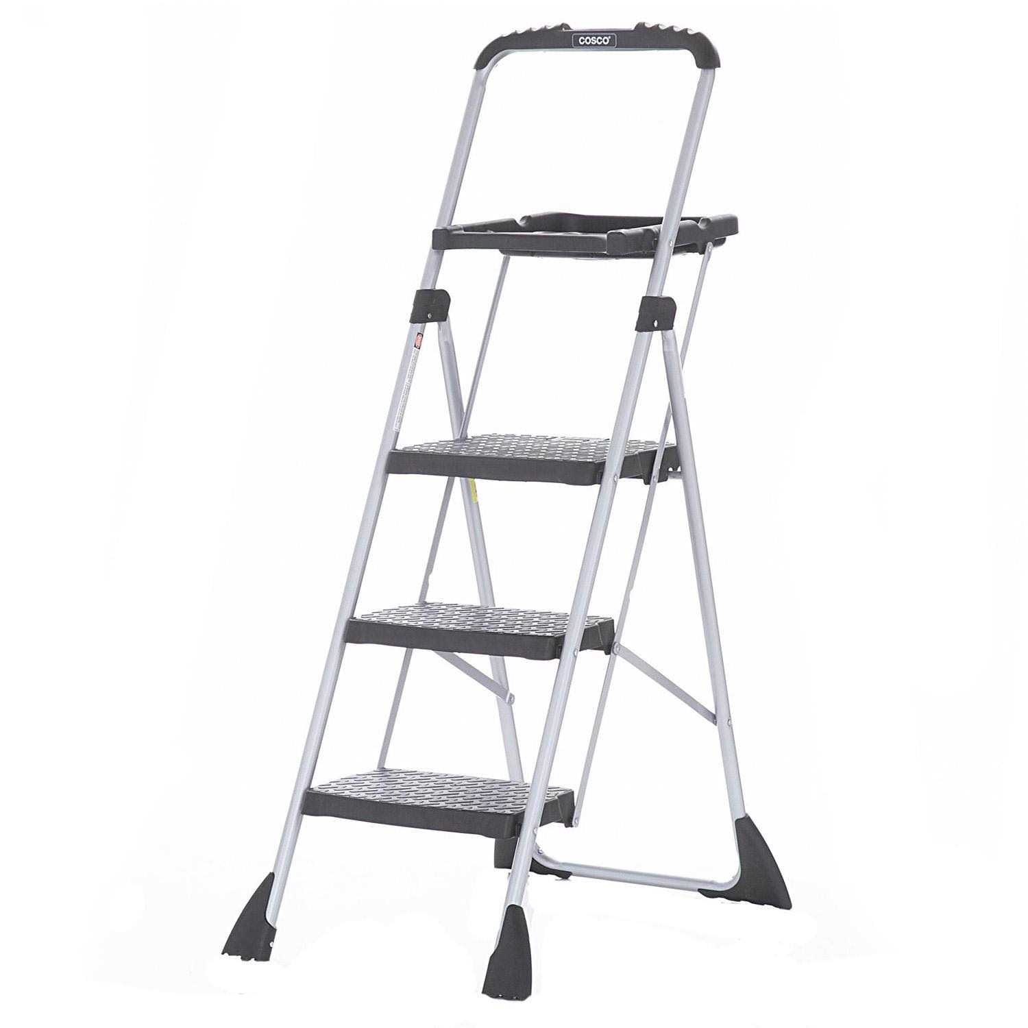 Lightweight yet durable steel work platform has three large heavy-duty polypropylene resin steps with slip-resistant treads and a large 14 3/4w x 12d top platform step. Handy molded utility tray holds tools, paint cans and wallpaper rolls. Extended hand-grip handle with tool holder. With non-marring, skid-resistant feet to provide stability and protect floor surfaces and easy one-hand fold and lock release. Select ladder of proper duty rating to support combined weight of user and materials.