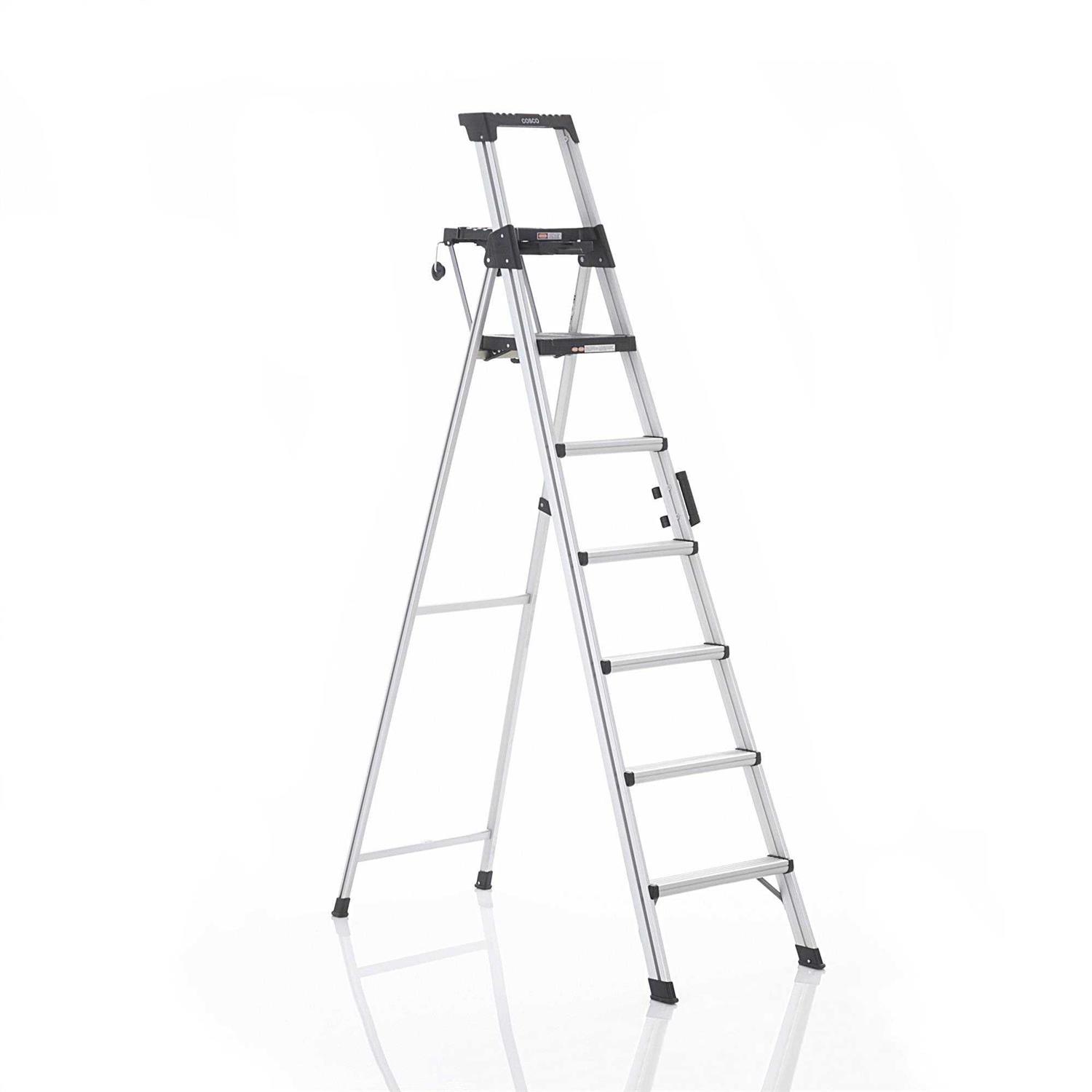 Aluminum construction. Large platform slip-resistant steps. Extended hand grip and tool holder. Skid-resistant leg tips. Dimensions: 5.5L x 23.75W x 99.75H inches. The versatile design of theCosco Signature Series 8 ft. Aluminum Step Ladder makes it ideal for commercial use and general contracting. This ladder features an aluminum construction with large platform steps and an extended hand grip and integrated tool tray. Skid-resistant leg tips keep it stable when in use. Folds easily for transport and storage.