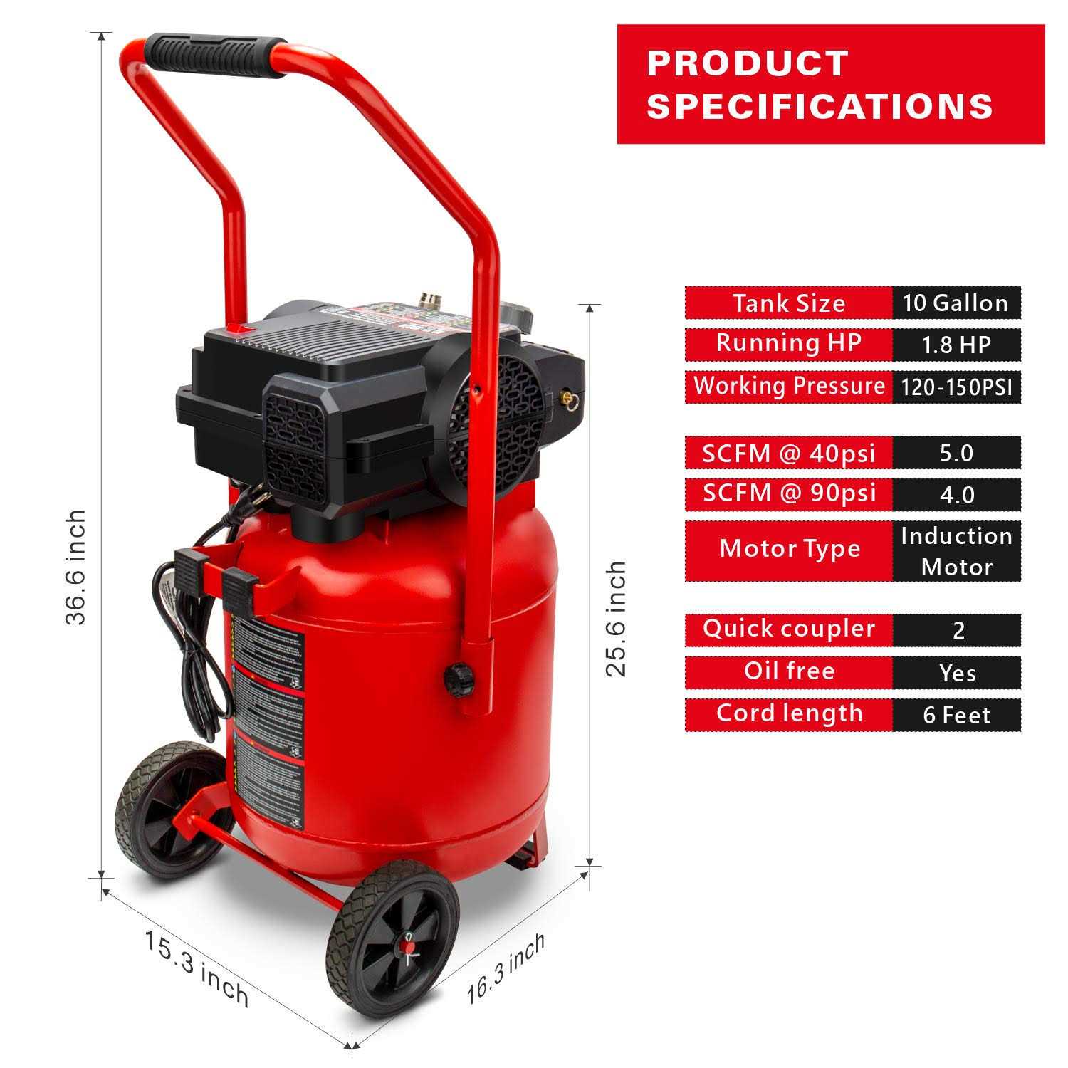 Brand Name: Craftsman. Tank Size: 10 gal. Tank. Style: Vertical. Portable: Yes. Product Type: Air Compressor Tank. Maximum Pressure: 150 psi. Horsepower: 1.8 hp. Corded or Cordless: Corded. Color: Red. Weight: 57.37 lb. Stages: Single Stage Wheeled: Yes Tank Material: Steel Air Delivery SCFM at 40PSI: 5 SCFM Tank Pressure Gauge: Yes. Air Delivery SCFM at 90PSI: 4 SCFM Air Compressor Pump Type: Oil-Free.