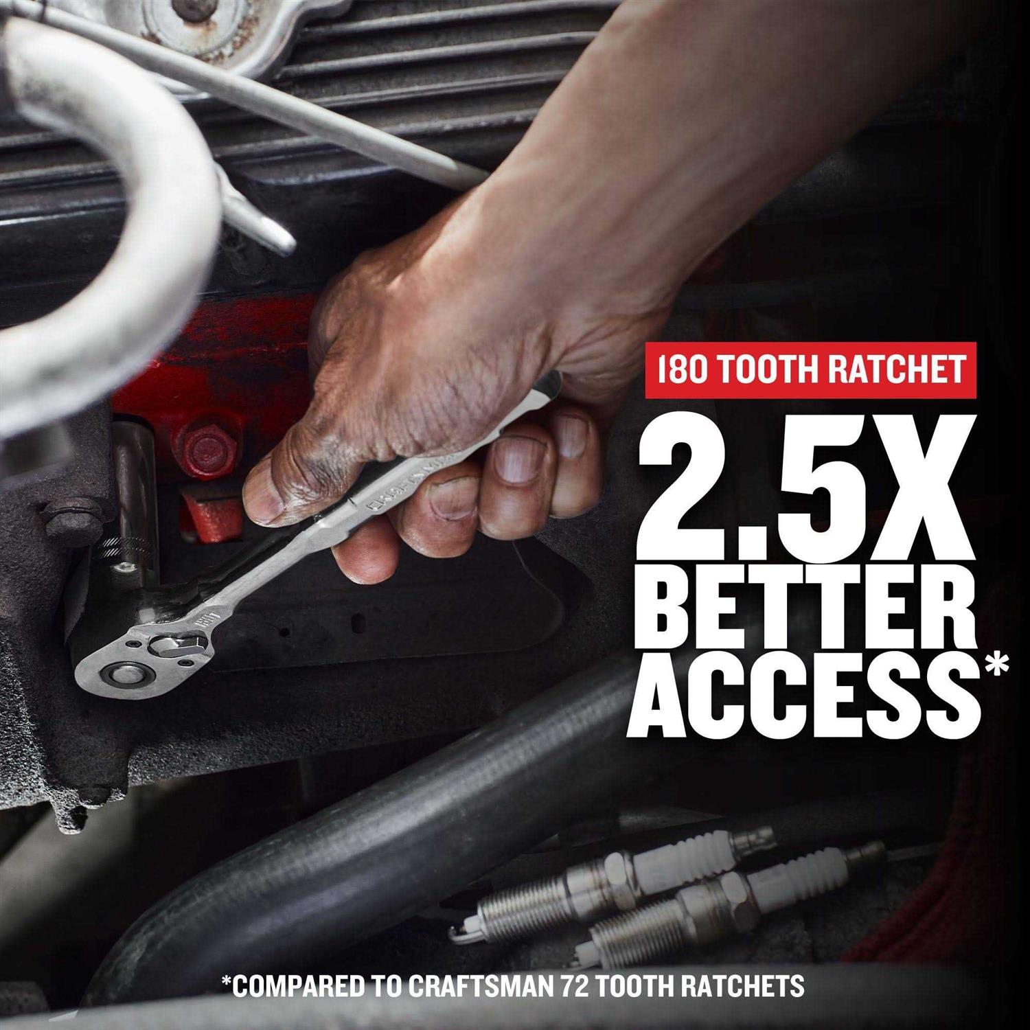 - 2.5X BETTER ACCESS(when compared to Craftsman 72 tooth ratchets): 180-Tooth Dual Pawl Mechanism.
