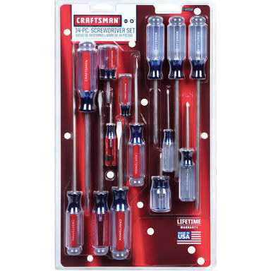 Screwdriver Bit Sets by Craftsman. Details:14 pc acetate screwdriver set features heat-treated, alloy steel blades for increased durability. A comfort optimized handle is ideal for high and low torque applications. Blades and shafts are coated with a satin-nickel finish to resist corrosion.