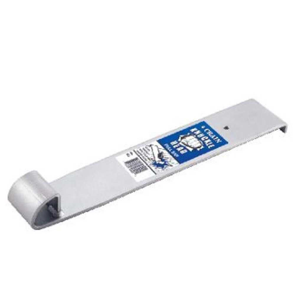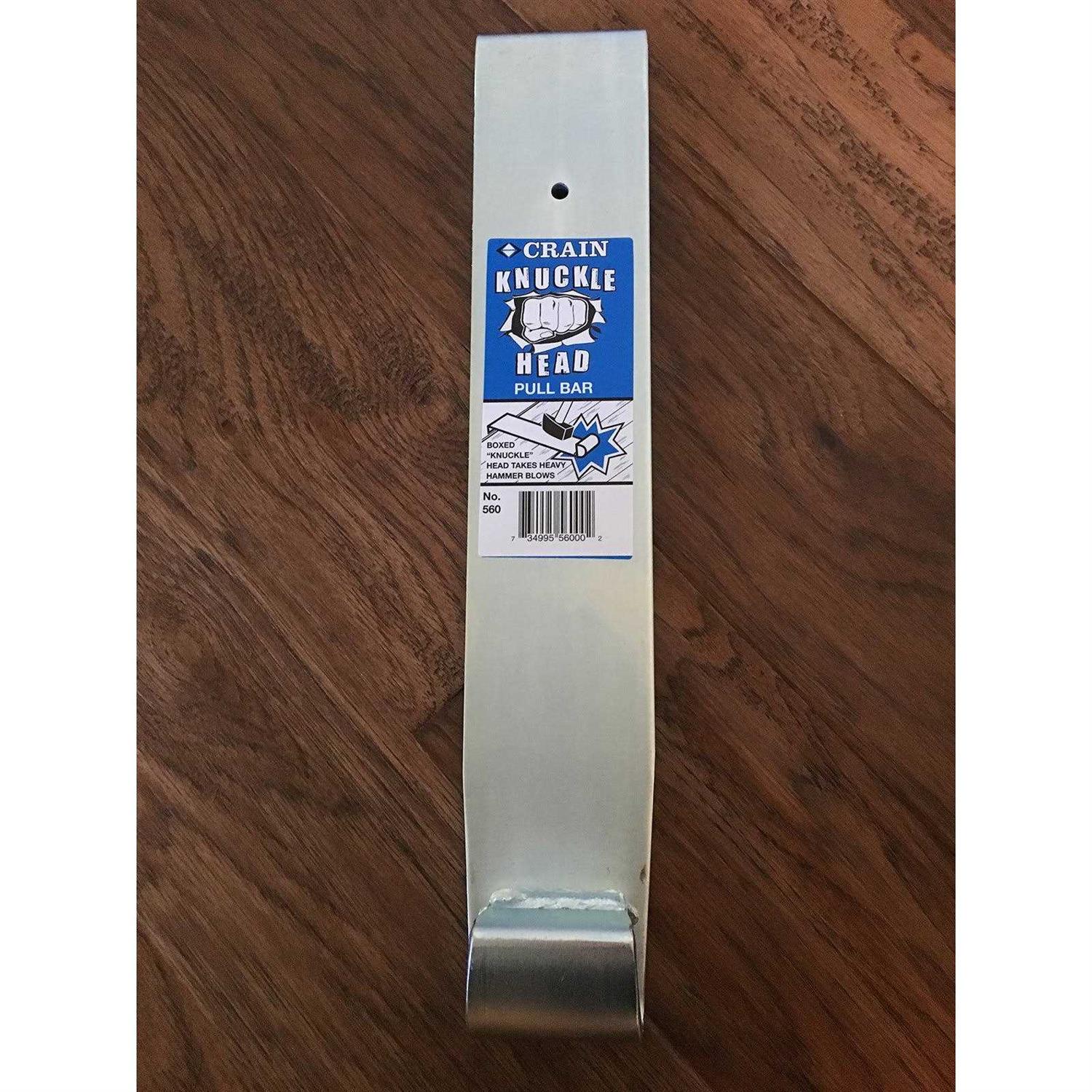 Crain 560 Knuckle Head Pull Bar This steel pull bar is designed to take heavy hammering when necessary to pull planks together. It has a boxed “knuckle-shaped” hammering head that is welded to the body. The 3/16′′ thick body is made 3′′ wide to reduce bending down the length as it is hammered. The tool is 16 1/2′′ long overall to create 14-1/2′′ of working room when used near the wall. Felt pads on its bottom surface reduce scratching the face of the plank. Net weight: 3-1/4 lbs. Steel pull bar designed to take heavy hammering when necessary to pull planks together. Boxed knuckle-shaped hammering head is welded to the body. 3/16′′ thick body is made 3′′ wide to reduce bending down the length as tool is hammered. 16-1/2′′ long overall for 14-1/2′′ working room when used near wall. Felt pads reduce scratching.