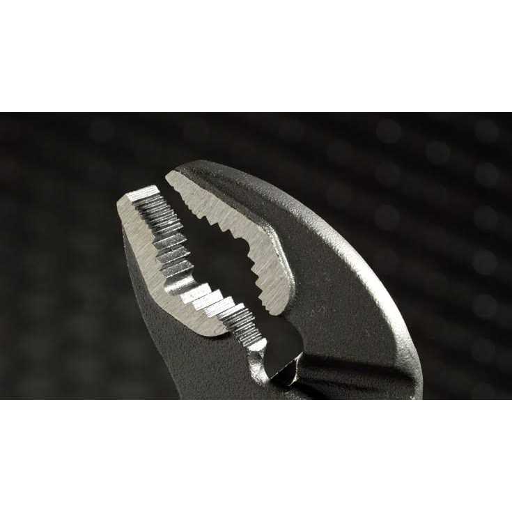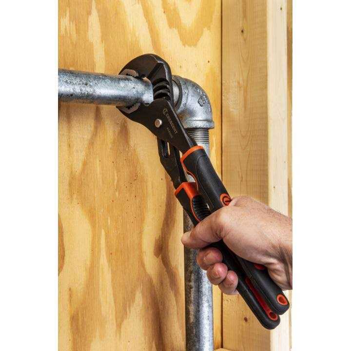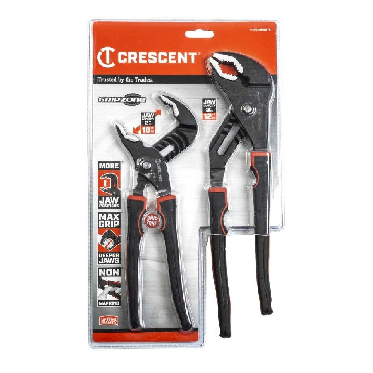 The handles feature an integrated non-marring pipe grip that allows for working on shower and sink fixtures without damaging the finish. The exposed steel handle tips are designed to prevent the handles from being pulled off and allow for reaming. The set includes a 10 in. and 12 in. size both with a V-shaped haw allowing for increased grip on various shapes and sizes. Set includes 10 in. and 12 in. tongue and groove pliers Features non-marring pipe grip to protect finishes Unique tooth design grips tighter, for increased torque Unique tooth design grips tighter, giving you increased torque from less effort V-shaped jaws allow for a firmer grip on various shapes Maximum durability from alloy steel construction with induction-hardened teeth Integrated non-marring pipe grip area made of high-impact rubber in the handle Black oxide finish wipes clean easily and resists corrosion Angled tooth design for increased grip on pipes and fasteners Set contains 2 tongue and groove pliers, in 10 in. and 12 in. sizes Bring the best and essential addition to your tool box by selecting this Crescent Tongue and Groove Pliers Set.