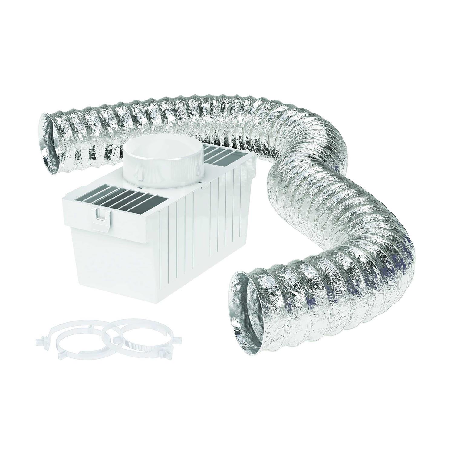 Intended for indoor use where external venting is impractical. Fits directly on to dryers with a rear spigot-type outlet, this kit is a uniquely designed water bath trap where the fine lint that is missed by the dryer filter is collected on the water surface. Simply fill to a 50mm depth of water and change when dirty. Suitable for dryers with a 100mm outlet flange or combine with DVS3 or DV4A diverter kits for dryers with flush outlet hole. Ideal for use where outside venting is impossible. Quick, easy installation! For use with electric dryers only!