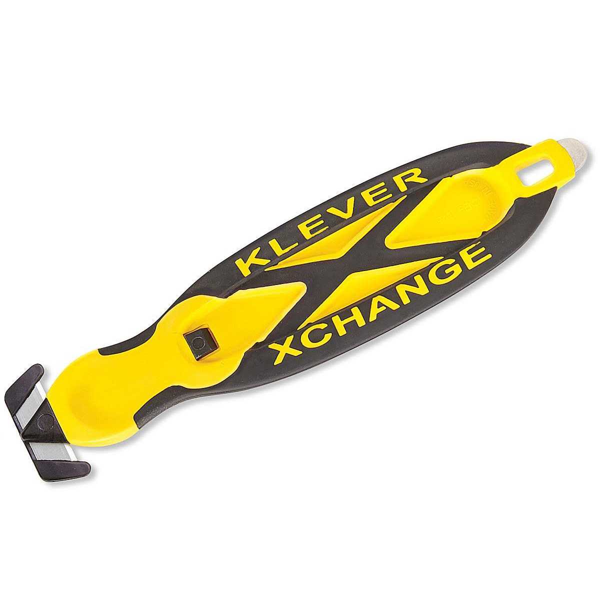 Deluxe Klever Safety Cutters – Combination of soft rubber grip and a comfortable ergonomic shape. Disposable blade head. Easy–release button. Dual–sided hook design with thick, recessed carbon steel blade. Lasts twice as long as single blade cutters. Built–in tape splitter reduces blade wear. Includes 1 blade. Replacement Blades available.