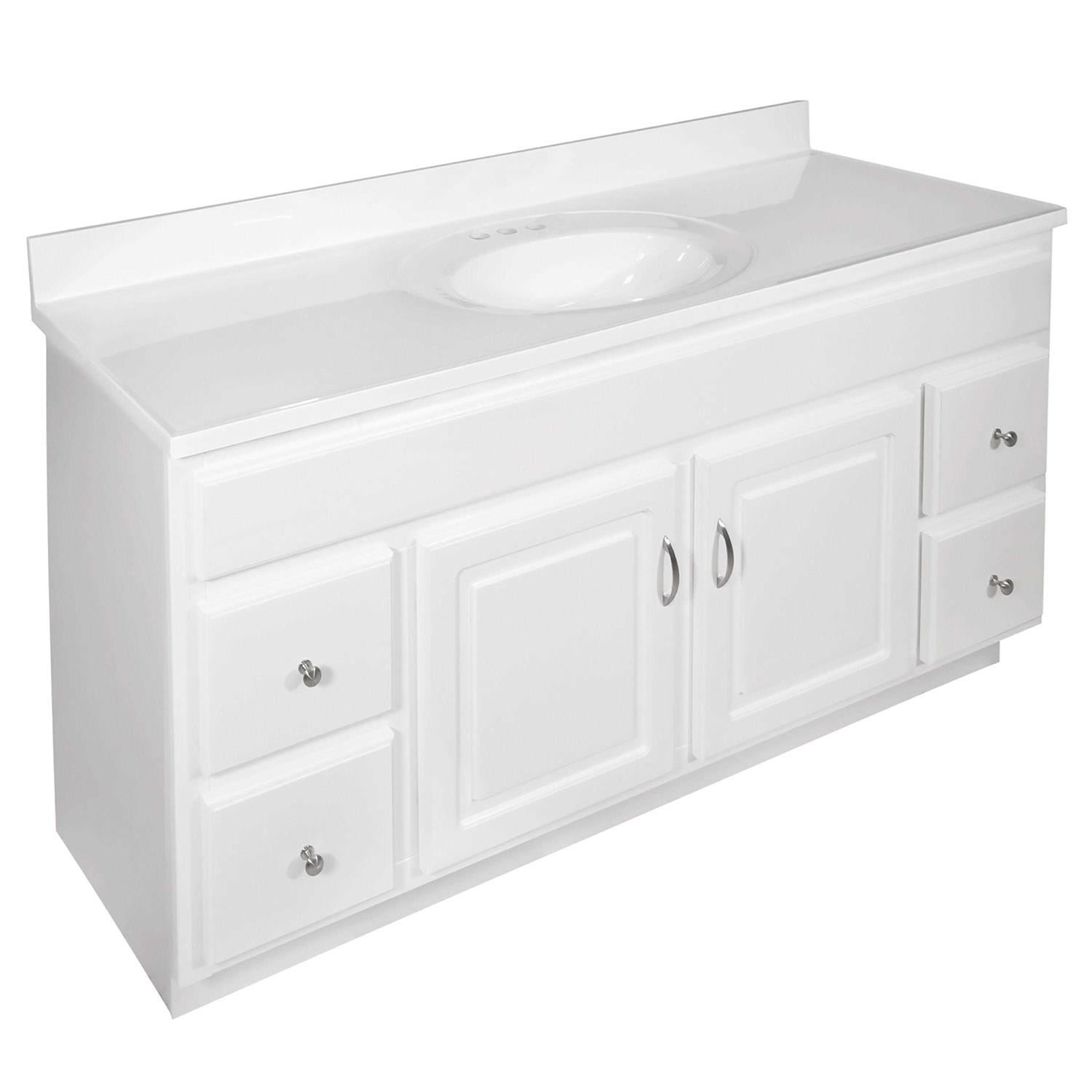 Add a touch of clean, bright elegance to your bathroom with the Design House Cultured Marble Vanity Top. This bathroom countertop is 61-inches long for use on 60-inch vanity cabinets and features a contemporary solid white finish. The oval bowl and square flat edge profile offer an updated yet modest look to blend seamlessly with any bathroom decor style. The sink in this single-bowl vanity top has three pre-drilled faucet holes that allow for a 4-inch centerset mount faucet. A single mount faucet with a deck plate will also work with this vanity top. The integrated sink features a safety overflow hole to avoid water overflow or spillage, while the 4-inch integrated backsplash helps prevent water damage to your wall. This bathroom vanity’s modern white marble surface is stain-resistant and easy to clean. Simply apply a mild, non-abrasive soap to the top and use a damp cloth to wipe clean. Designed and manufactured by Design House, the trusted source for quality lighting, hardware, plumbing, kitchen, and bath products for every taste and budget.