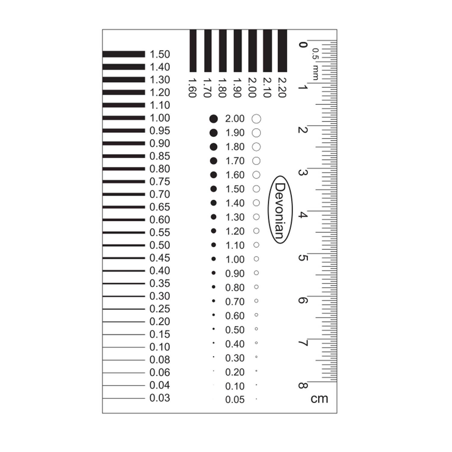 1.versatile, can measure the length, width of cracks, scratches, and point diameter, area, etc. 2. Accurate measurement, point diameter 0.05-2 mm, line width 0.03-2.2 mm, accuracy ±0.01 mm. 3. Transparent PET material, flexible and durable. 4. The size is 61 x 96 mm, and the mini size is very convenient to carry and store. 5. Easy to use, put the ruler on the crack, scratch or point to be measured, select the appropriate line width or point for comparison, and measure the crack, scratch width and point size.