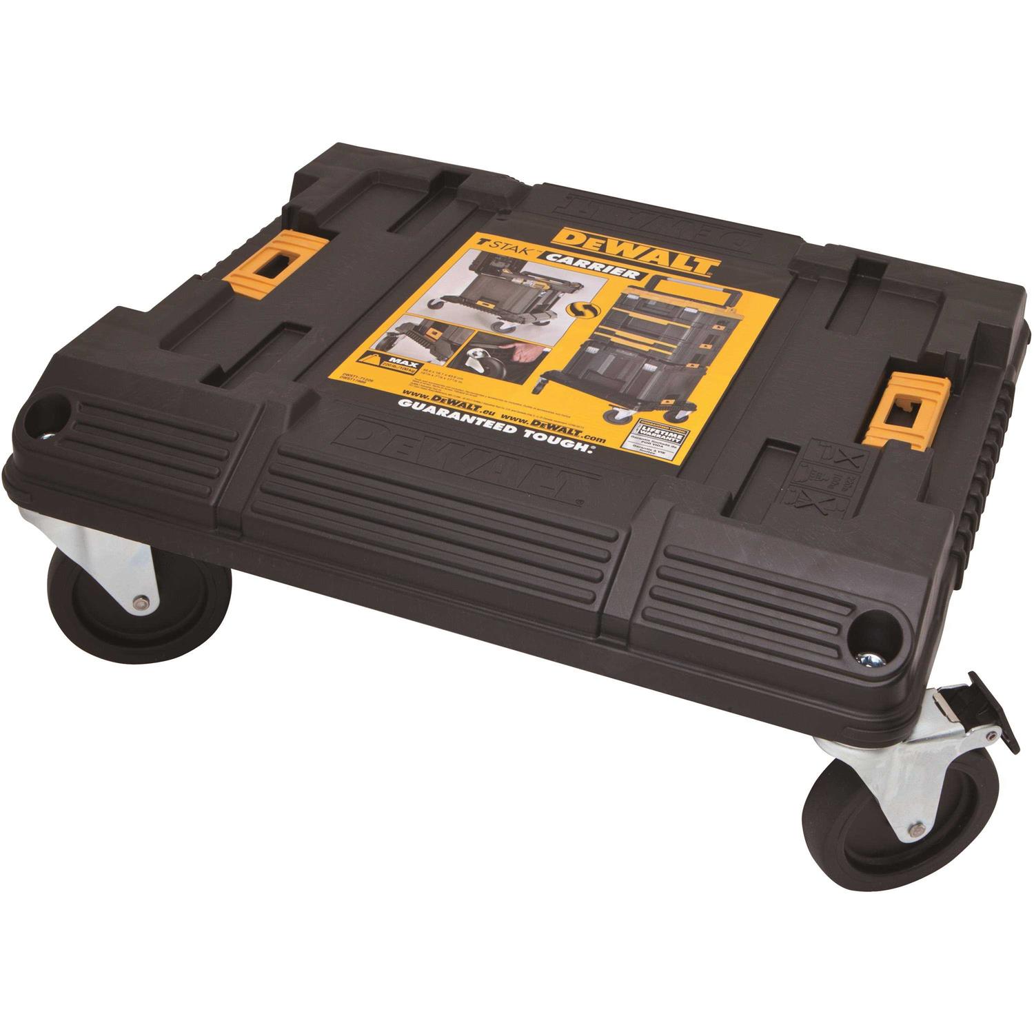 The DEWALT TSTAK Cart is ideal for holding and moving around your various tool and accessory boxes. This cart is part of the innovated DEWALT TSTAK system of interlocking, stackable storage boxes and is compatible with all other items from the collection. It has a maximum weight capacity of 220 pounds, so you can use it to hold every item that your job requires. The plastic wheeled cart is lightweight; at just 7.13 pounds you can carry it wherever you need to go, and you can hang it from the wall to save floor space when you aren’t using it to move boxes. This cart’s base features a locking mechanism to hold the stack of boxes securely and prevent accidents. It features incredible maneuverability thanks to its four rotating wheels.