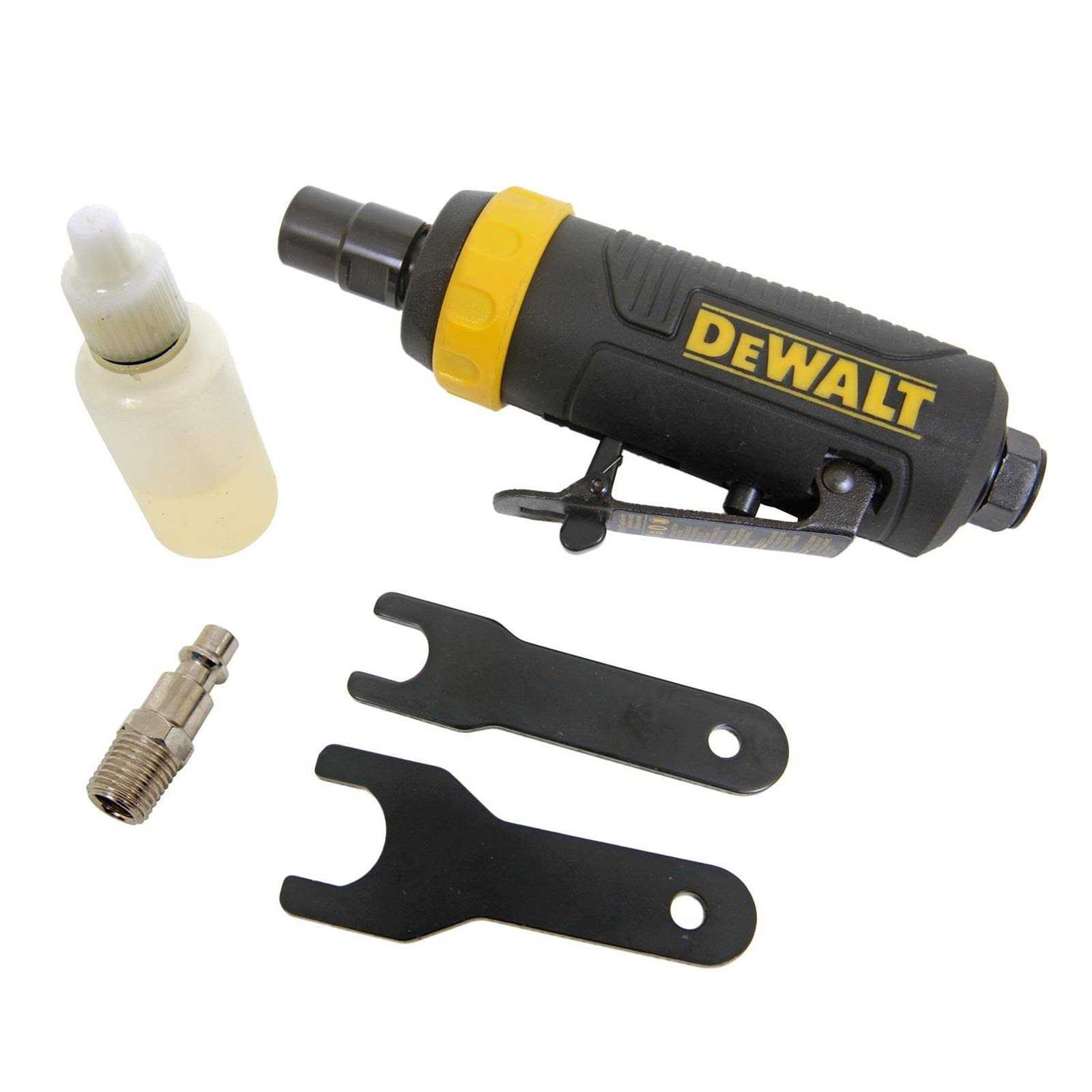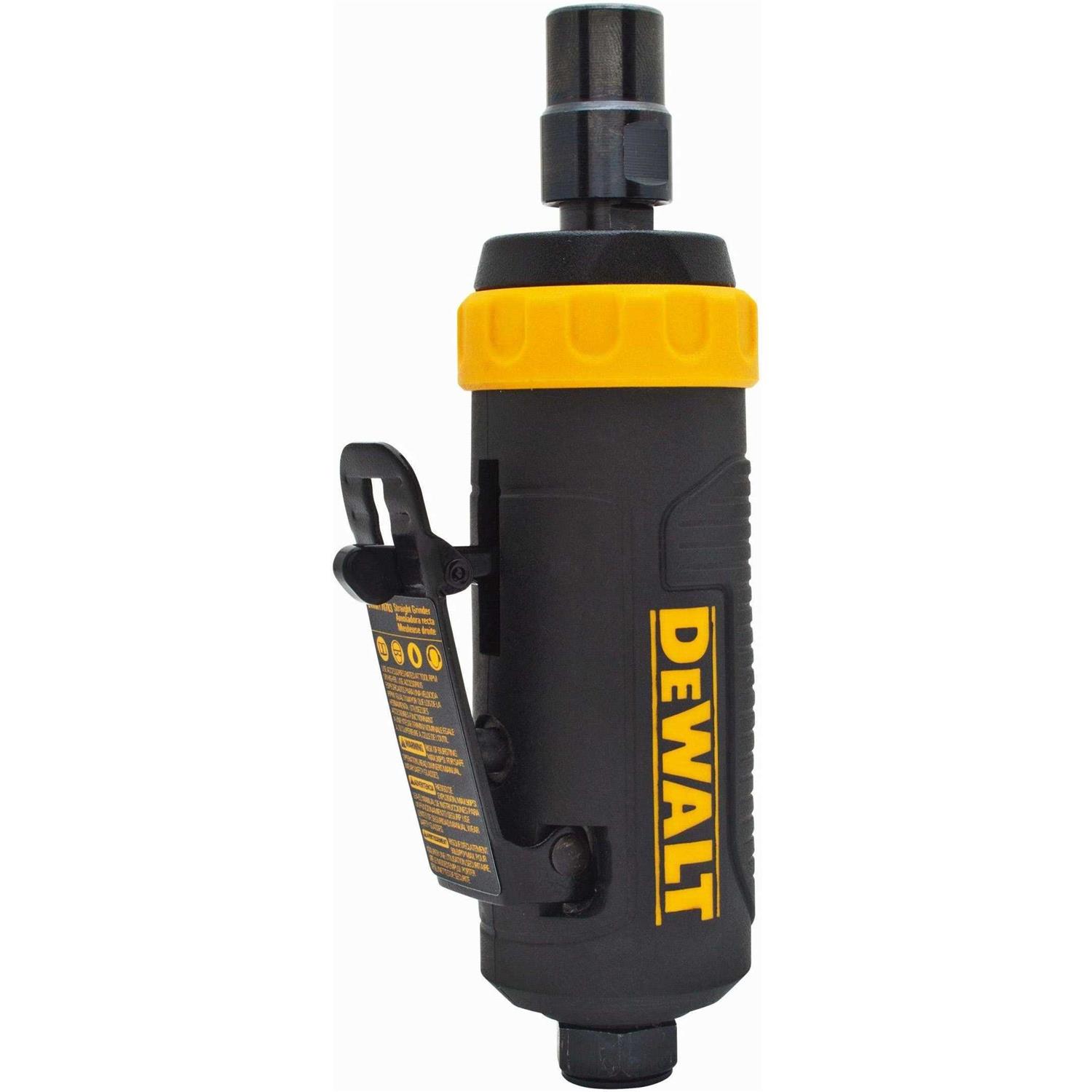 DEWALT DWMT70783 straight die grinder features a light weight aluminum body with an ergonomically designed cushion grip for user comfort and ease. This grinder has a touch control trigger for easy user control. It has a 1/4 inch air inlet, works with 1/4 inch and 1/8 inch collets, and a safety throttle lever for protection. The DWMT70783 grinder offers rear air exhaust to direct away from the tool.