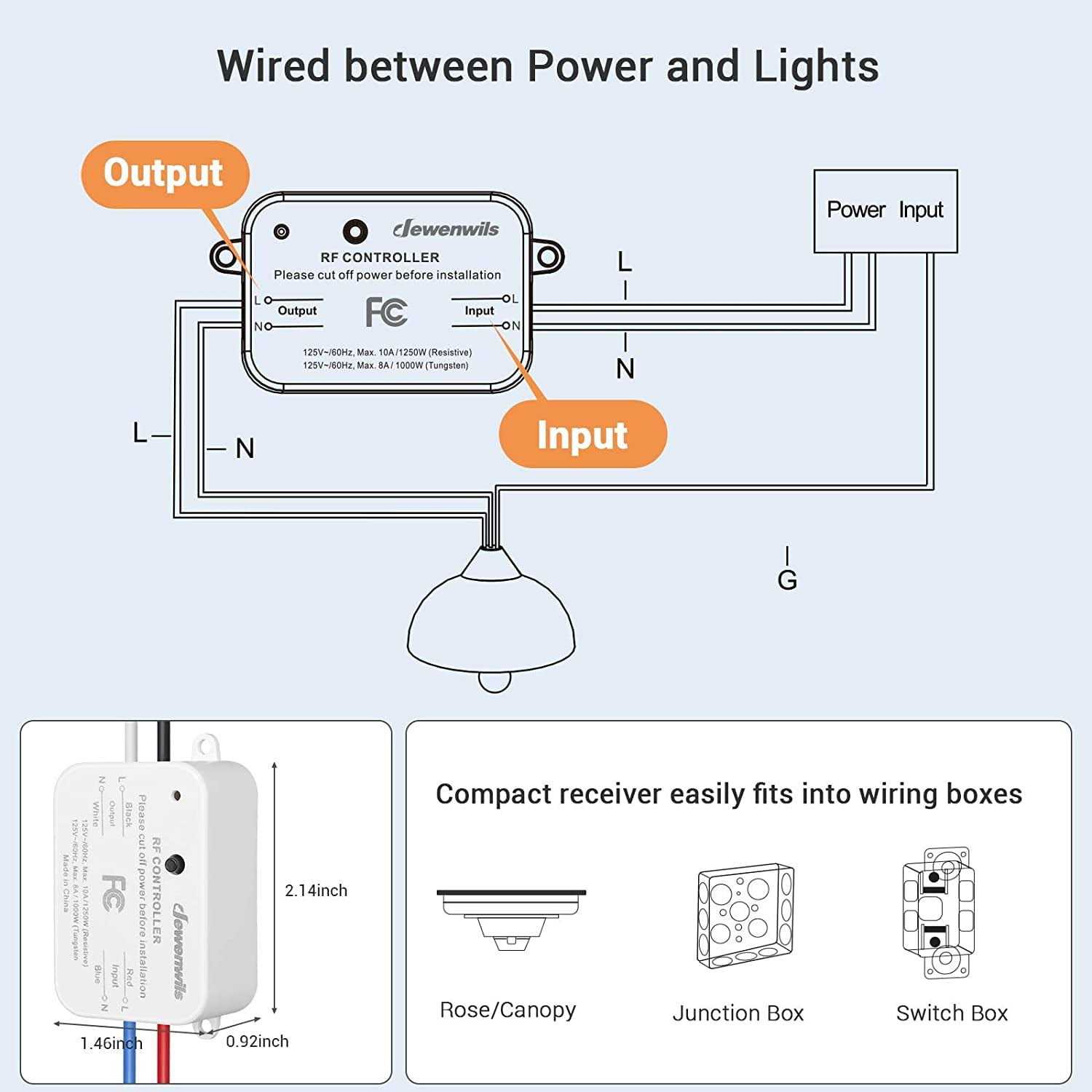 The remote switch can remotely control 100 feet of RF wireless remote range, and the powerful RF signal can pass through walls and doors without any interference. It is a detachable wall switch and compact receiver kit, no in-wall wiring is required, the RF remote control wall-mounted switch can be installed anywhere. The transmitter wall switch and receiver are pre-programmed for immediate use.