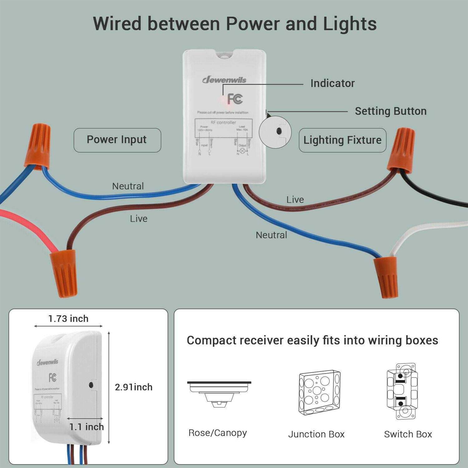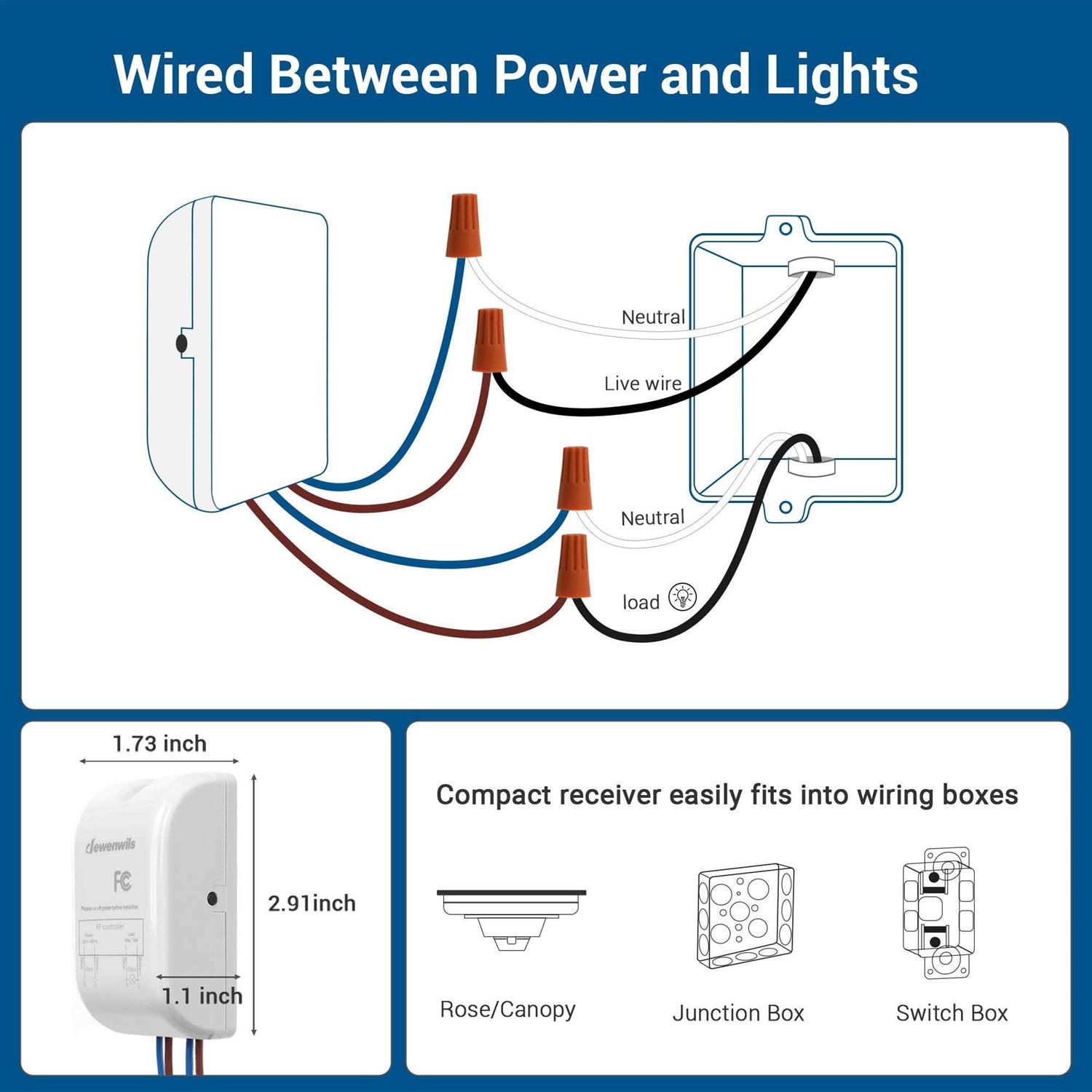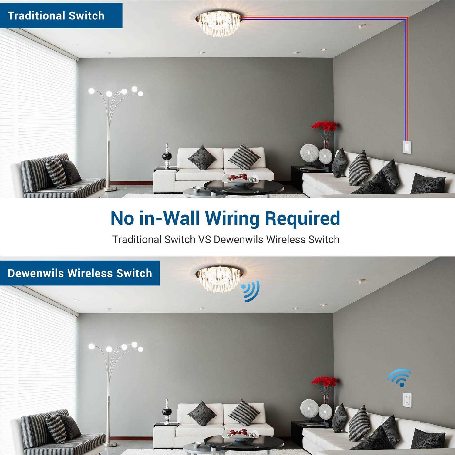 DEWENWILS White wireless light switch and receiver kit allow to add ON/OFF wall light switches to the existing lighting system freely, no in-wall wiring or tearing walls needed, won’t affect the existing system. The detachable switch can be used as wall switch or portable handheld remote; with compact design, you can mount the receiver in limited spaces like rose/canopy, electrical junction box, and switch box, easy to hide in ceiling or mount on the surface. Strong RF signal works through walls and doors without any interference; does not require line of sight while using; up to 100ft range in open areas. Switch and receiver have been pre-programmed for immediate use, apply for any lights like halogen, incandescent, CFL, fluorescent, LED light in bathroom, bedroom, kitchen, living room, etc.