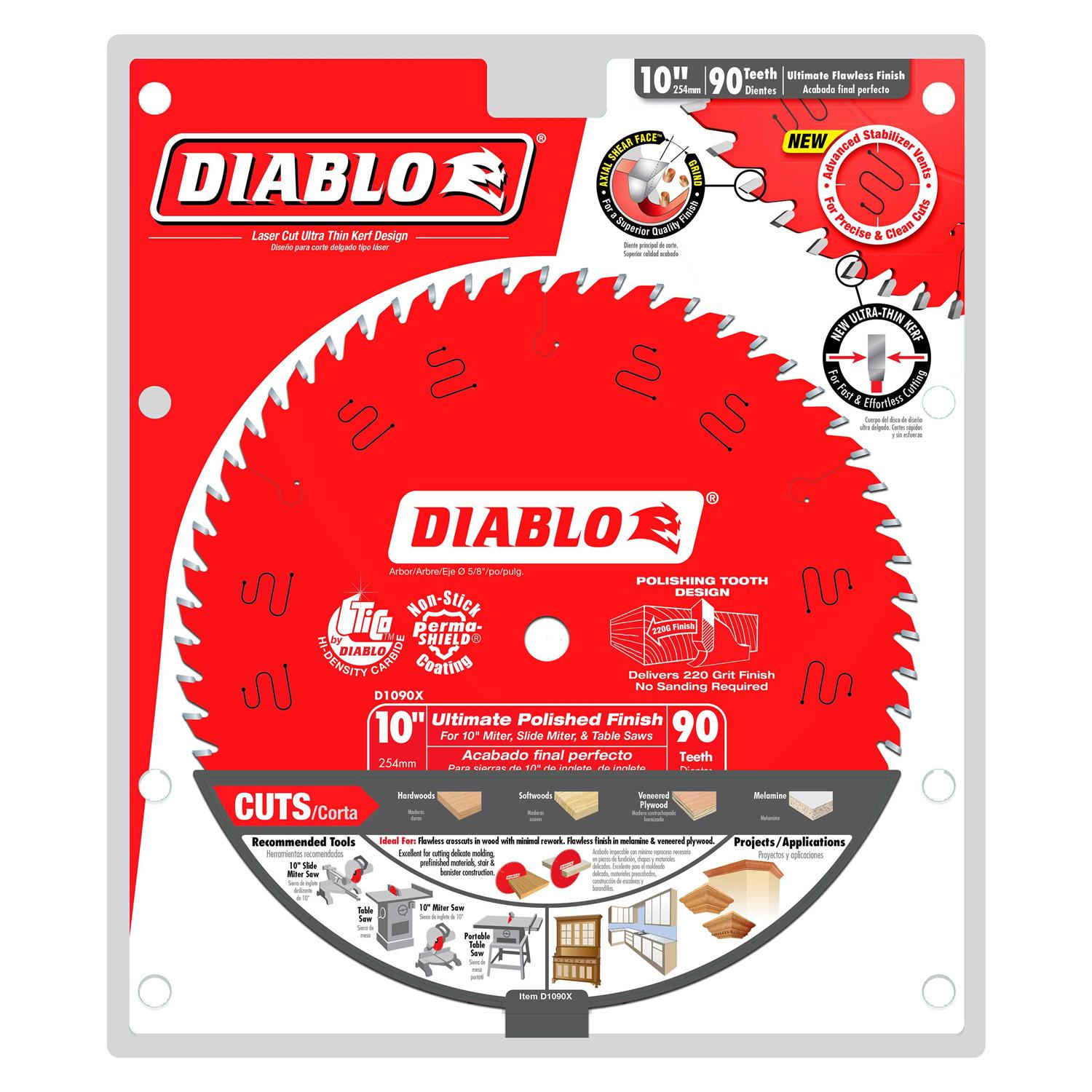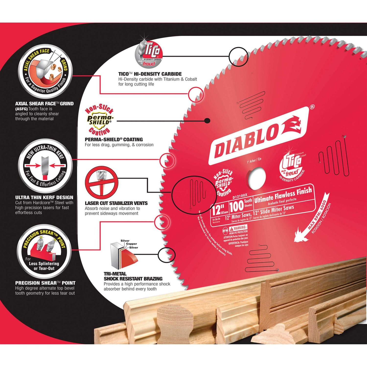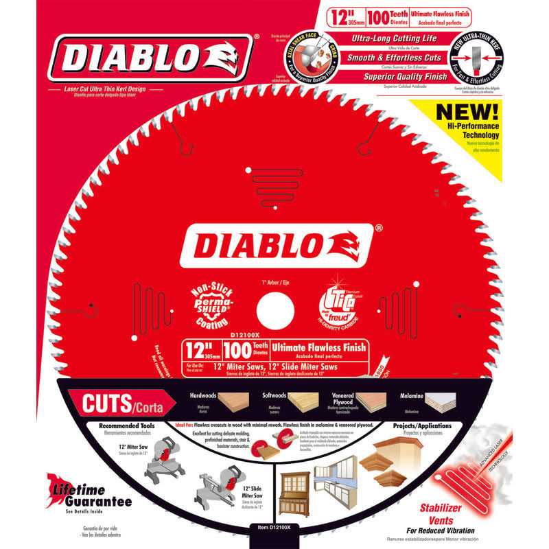 The Diablo 12-inch X 100 tooth Ultimate Flawless Finish saw blade is ideal for cutting timbers, fine moldings, veneered panels, melamine and MDF. Its Axial Shear Face Grind (ASFG) geometry gives you a clean finish that does away with the need for extra sanding or reworking. The saw’s TiCo high-density carbide teeth use an exact blend of cobalt, titanium and tungsten to provide the correct level of hardness and strength for its specified purposes. With its ultra-thin kerf, the Diablo 12-inch Ultimate circular saw blade cuts through work pieces easily using less power, enabling portable job site saws to achieve the same level of precision as stationary saws. Thanks to its many innovative features, this Diablo 100-tooth circular saw blade offers consistent performance throughout its cutting life. It lasts up to five times longer than standard saw blades. A Perma-SHIELD nonstick coating protects the blade in several ways, including prevention of gumming, humidity and corrosion. The smooth surface reduces blade drag as well, avoiding extreme heat and blade distortion.