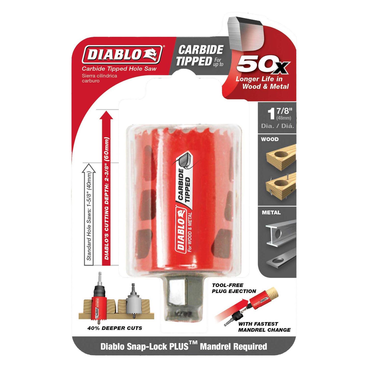 Diablo introduces the first carbide-tipped hole saws on the market to cut both wood and metal (wood, nail-embedded wood, plastic, aluminum, metal, cast iron, stainless steel and metal). Delivering 50 times longer cutting life than bi-metal, these new carbide-tipped hole saws offer faster cutting performance and increased productivity.