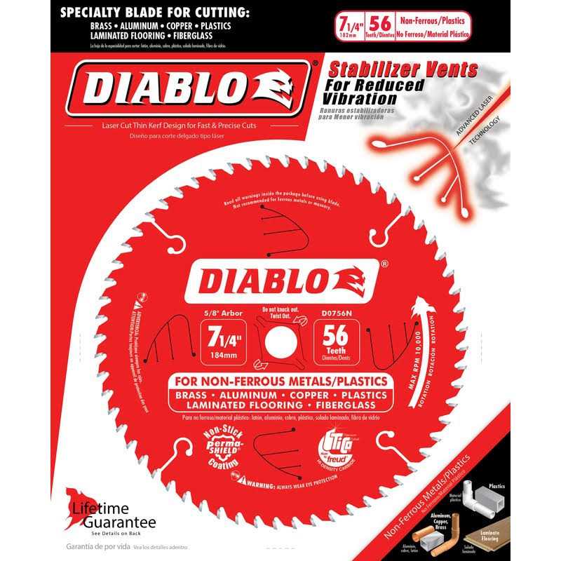 Diablo’s finishing blade is ideal for smooth finish crosscuts in hardwood, softwood or plywood. These blades are the perfect choice when seeking high quality rips and crosscuts using a portable saw. The combination of Diablos application specific TiCo Hi-Density carbide teeth and a super thin-kerf blade deliver smooth cuts, increased cutting speed and longer life. A great choice for jobsite finish cuts in 1X, decking, fencing, fascia and plywood. Specially formulated Diablo TiCo Carbide withstands impact, reduces wear and lasts longer in fine finish applications. Perma-SHIELD non-stick coating protects the blade against heat, gumming and corrosion. Advanced Laser Cut Stabilizer Vents traps noise and vibration for maximum stability, keeping the blade cool with accurate cuts in wood. Super Thin Kerf Design provides less resistance and heat build-up for ease of cut, accuracy and longer cutting life. Tri-Metal Hock Resistant Brazing provides a high performance shock absorber behind every tooth. Laser Cut Arbor reduces vibration and premature wear for accurate blade rotation on cordless and corded saws.