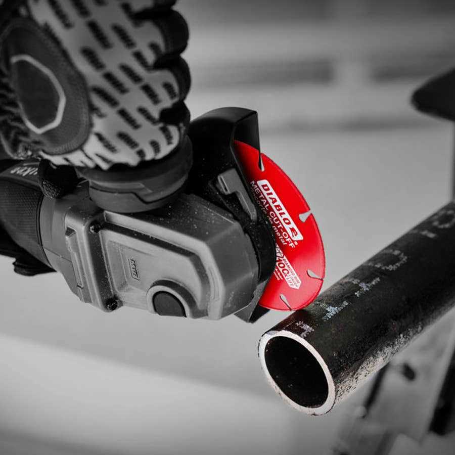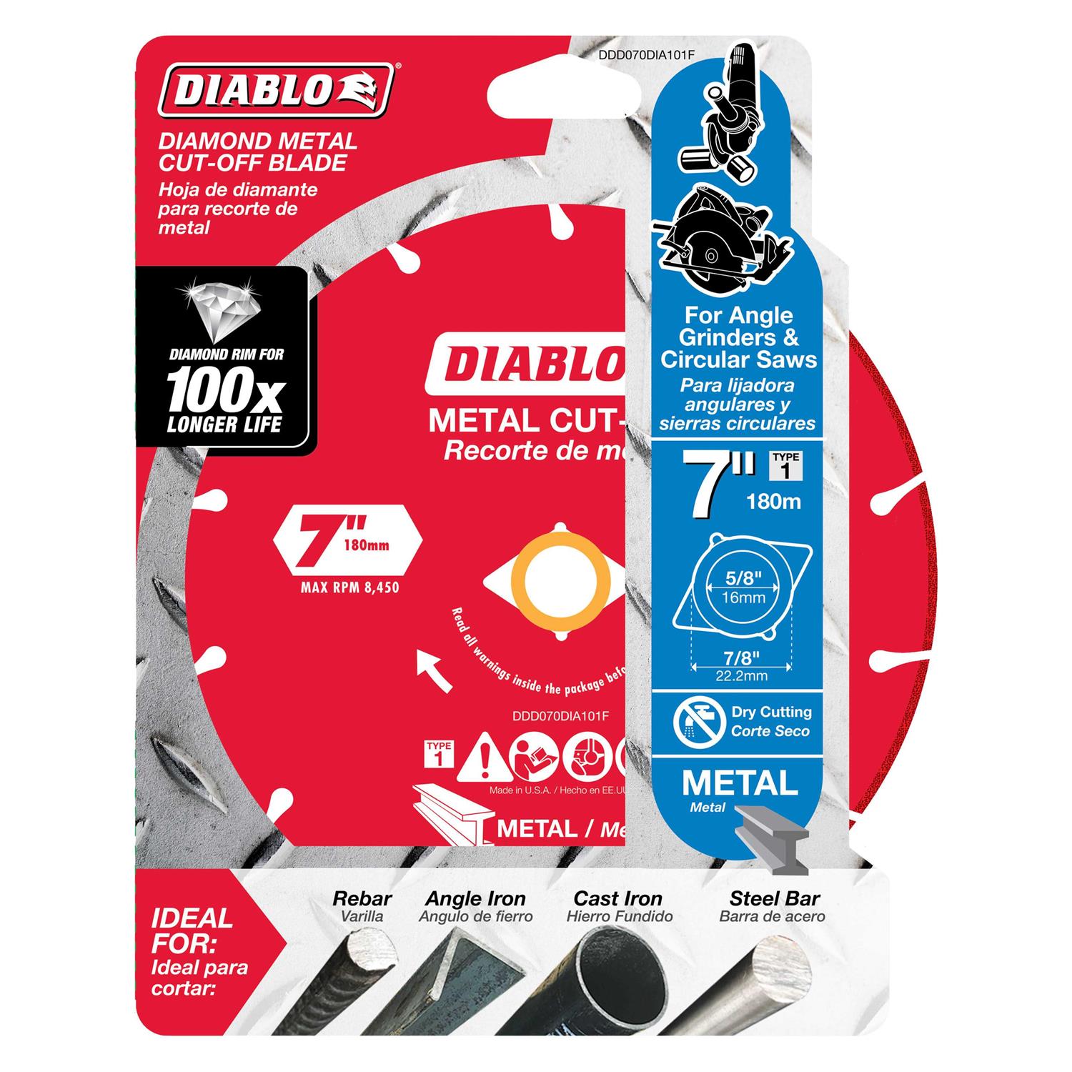 Diablo’s new diamond metal cut-off wheels deliver extreme durability, minimal downtime and increased productivity. These diamond rimmed wheels deliver 100X longer cutting life versus a standard bonded cut-off disc in some of the most intense metal cutting situations. The wheel’s long lasting durability maximizes cutting even in extreme applications such as rebar, angle iron, cast iron and steel bar. Diablo’s diamond metal cut-off wheels not only provide long lasting cutting life, durability and control, but they also allow for a safer cutting experience. For use on angle grinders with a max RPM of 8,450 Ideal for cutting rebar, angle iron, cast iron and steel bar Diamond rimmed wheels for up to 100x longer cutting life Diamond rimmed wheels deliver up to 100X longer cutting life and durability when compared to 1-standard bonded cut-off disc Advanced electro-plating process for even distribution of diamond abrasive cutting edge Maintains cutting diameter for consistent cutting results Diamond technology is safer to use versus bonded discs by providing more control, less sparks and less dust Diamond wheels do not shatter or break when dropped Ideal for cutting rebar, angle iron, cast iron and steel bar For use on angle grinders with a max RPM of 8,450 7/8 in. arbor Bushing included for conversion to 5/8 in. arbor New Diablo Diamond Metal Cut-Off Disc features Make consistent cutting easier with the help of this reasonably priced Diablo Diamond Wheel for Metal Cutting. Provides durability.