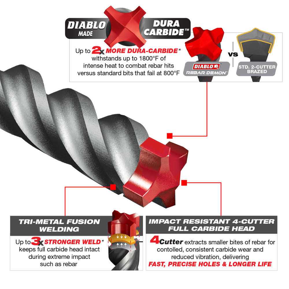 - DIABLO made Dura-Carbide withstands impact and high heat applications, dramatically extending life versus standard hammer bits