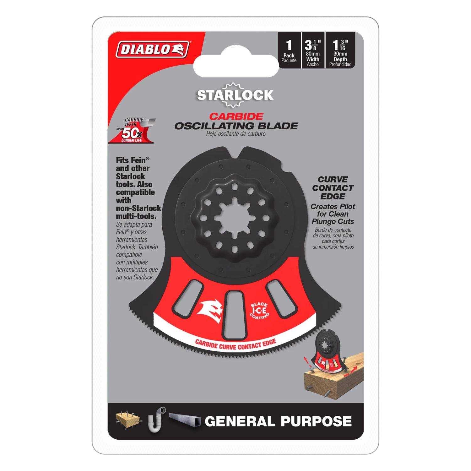 Diablo’s Starlock carbide oscillating blades feature application specific designs that deliver extreme durability and superior cutting life in general purpose cuts: nail-embedded wood, clean wood, metal and plastics. High-performance carbide teeth deliver an unmatched up to 50X longer cutting life versus standard bi-metal blades. Curve contact edge creates a pilot for precise, clean plunge cuts with less vibration. An optimized blade design and Black I. C.E. (Industrial Cooling Element) keeps the teeth cool and build up free for fast, clean cuts. Tool free quick-change interface fits Fein and other Starlock tools; also compatible with non-Starlock multi-tools.