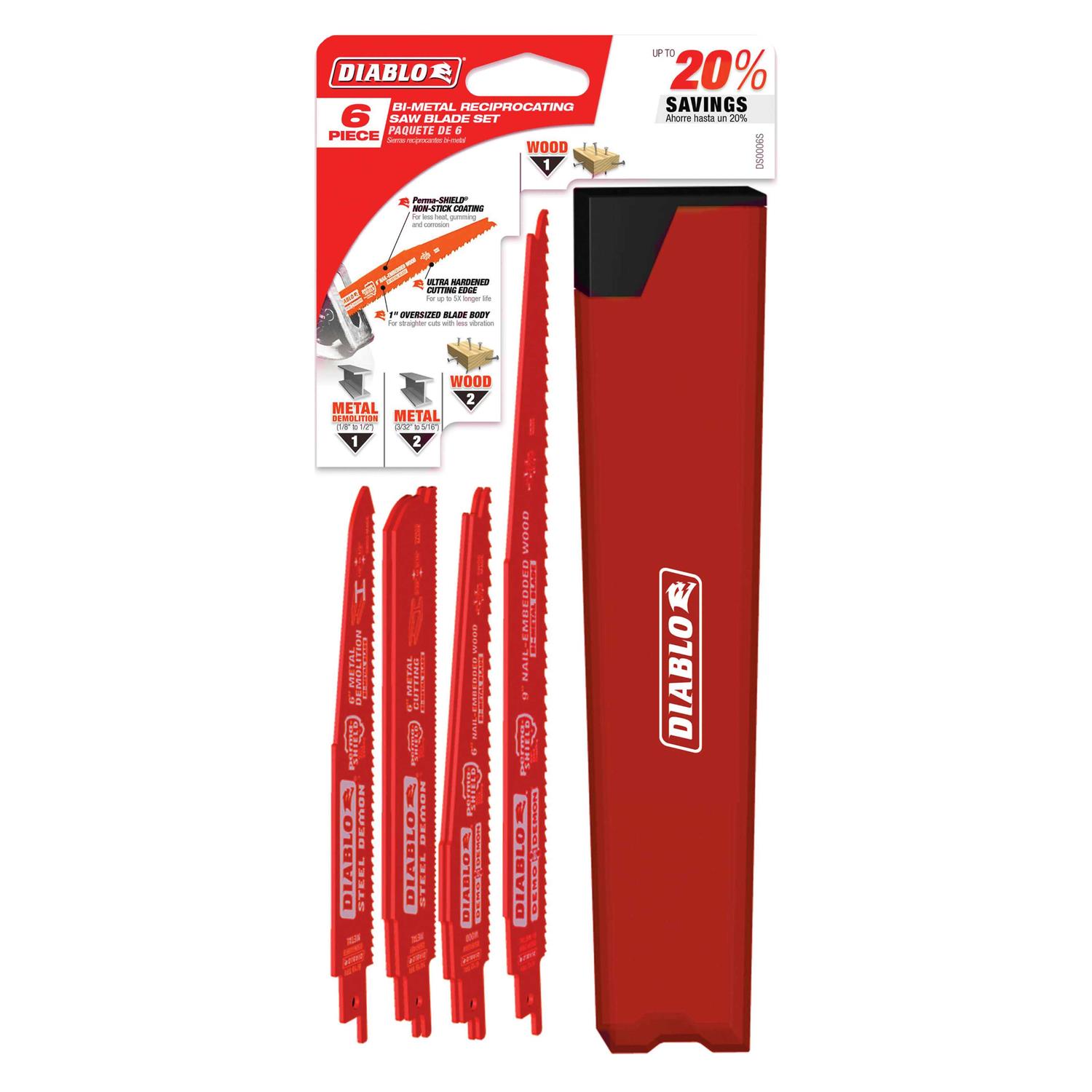 Diablo’s six-piece demolition reciprocating saw blade set brings together two of the brands top selling blades – Demo Demon and Steel Demon. Diablo’s reciprocating saw blades are specifically designed for maximum performance in nail-embedded wood and metal cutting/demolition applications. These high-performance blades feature bi-metal technology that delivers up to 5X longer life of standard blades on the market. Diablo’s Demo Demon blades feature patented variable tooth technology that provides faster cuts with less vibration. Diablo’s Steel Demon blades feature a double tooth configuration with small gullets for faster material removal and extra durability. This set is ideal for the Pro and offers up to 20% savings. Free storage case included.