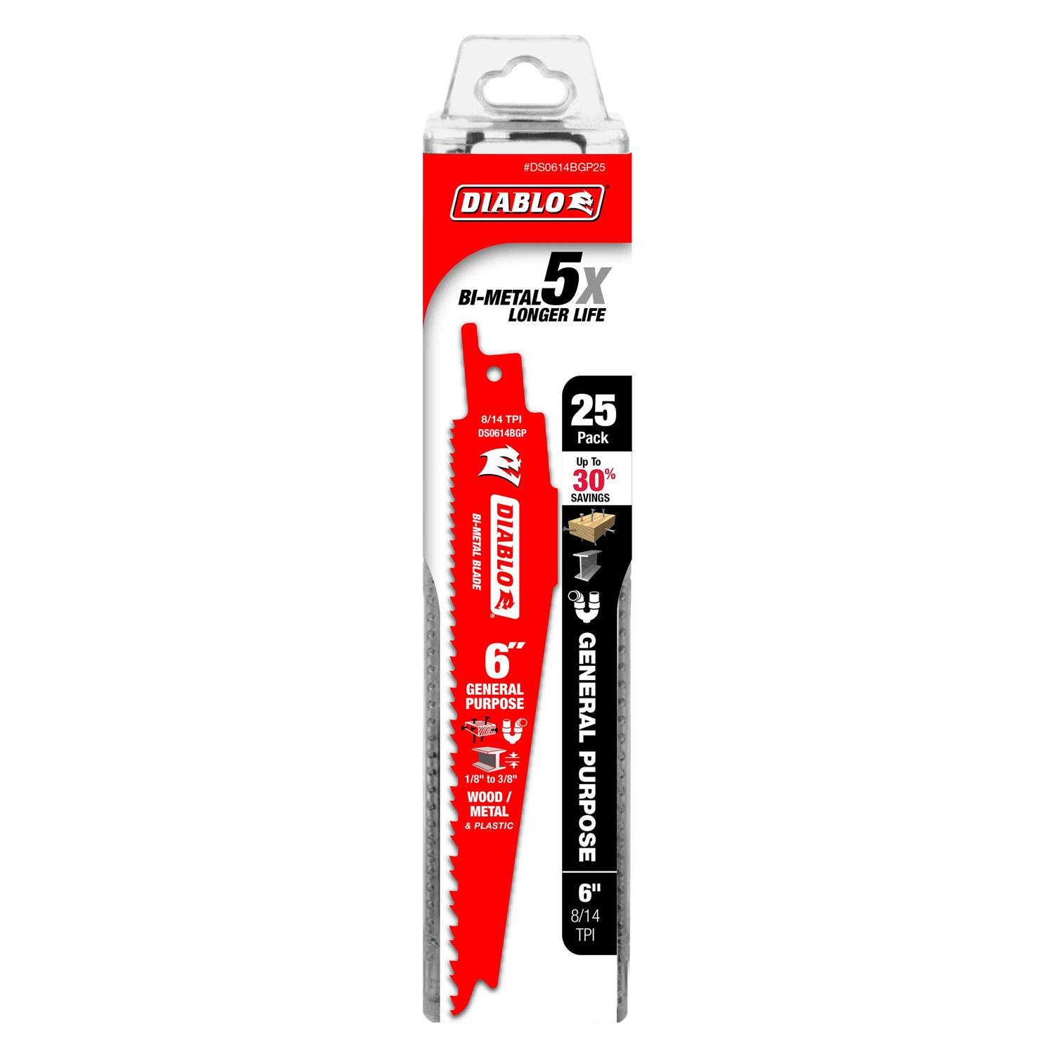 Diablo’s reciprocating saw blades are specifically designed for maximum performance in general purpose (nail-embedded wood and metal) applications. These high-performance blades feature bi-metal technology that delivers up to five times the longer life of standard blades on the market. Diablo’s patented variable tooth technology provides faster cuts with less vibration.