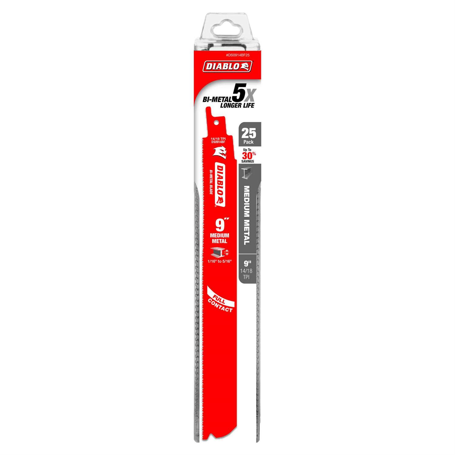 Diablo STEEL DEMON Bi-Metal Reciprocating Blades deliver 5x the performance of standard blades. The ultra hardened edge is created through a unique heat treatment process that optimizes the bi-metal teeth durability. Full Contact Arched Design provides more working teeth within the material for faster cuts in fewer passes resulting in less heat build-up to deliver 5x longer cutting performance Dual Tooth design features a double tooth configuration with small gullets for faster material removal and extra durability. Perma-shield coating protects the blade from heat, gumming, and corrosion 1 in Demolition body for straighter cuts with less vibration.