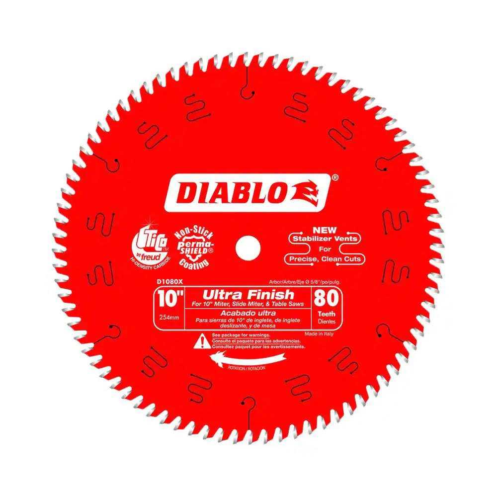 Diablo’s next generation 10 in. x 80 Tooth Ultra Finish Carbide Circular Saw Blade features new laser-cut stabilizer vents for precise and clean cuts in a variety of wood materials. The advanced stabilizer vents feature a permanent filler baked in from top to bottom for absorbing noise and preventing sideways movement, allowing the blade to slice through wood cleanly, quickly and accurately. Constructed with TiCo Hi-Density special-blend carbide, Diablo’s 10 in. ultra finish blade produces precise cuts and provides 5X longer cutting life. The laser cut heat expansion slots allow the blade to expand and contract during use, keeping the cut true and straight. This blade is excellent for projects such as cutting fine molding and double-sided veneered plywood for cabinets and furniture.