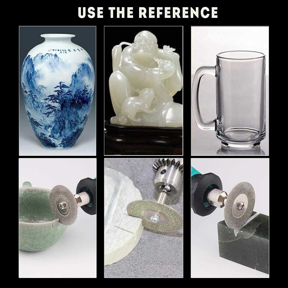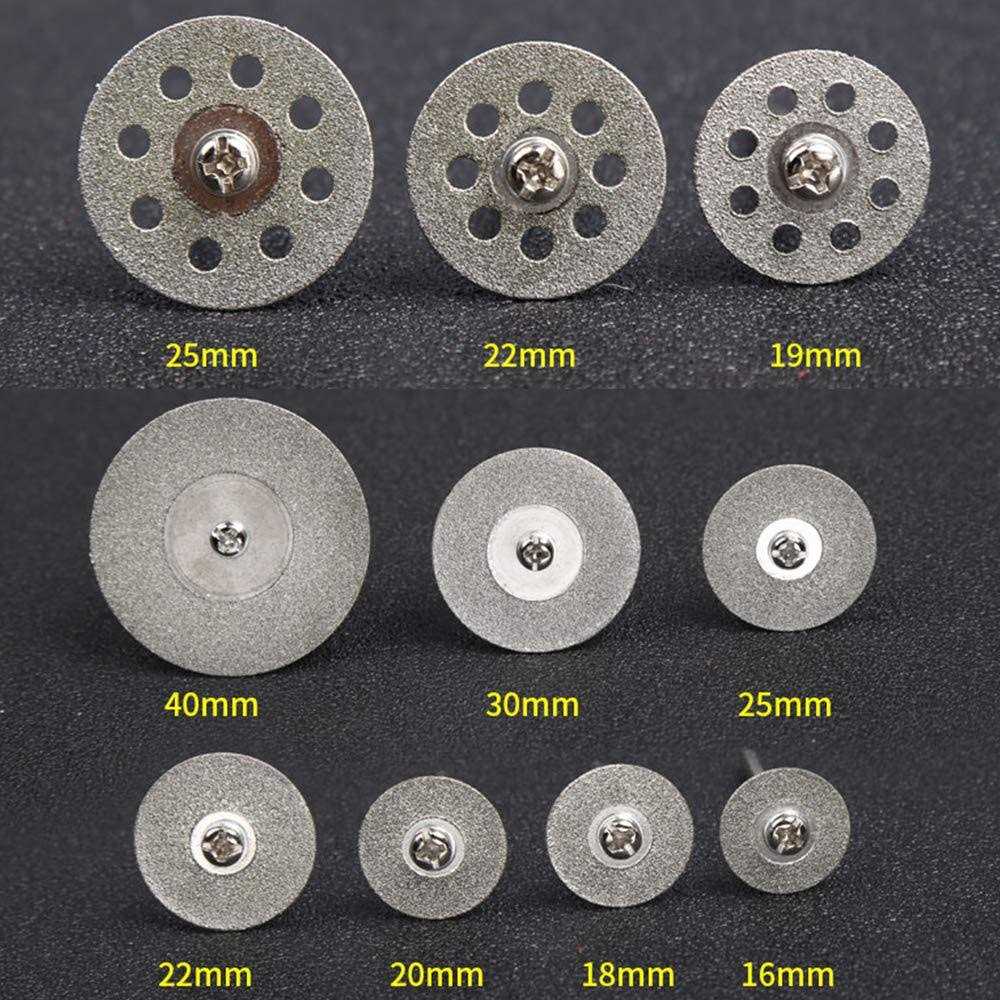 Designed for Dremel Wen ect. Rotary Tools . Turn your Dremel or other rotary tool into high-speed cut-off saw & grinding machine Steel wheels have 200-grit industrial diamond permanently brazed to surface Hardest cutting/abrasive material available for use with glass, tile, stone – even hardened steel Shank Diameter:3.00mm, Wheel diameters 5/8″, 3/4″, 7/8″, 1″, 1-1/8″, 1-1/2″; solid and with vent holes Each with 1/8″ x 1-3/4″ mandrel & screw; includes bit holder case with clear cover Size:Φ:3.00mm Main purpose: Stone / Jade / ceramic / glass / Carbide / cutting / grinding / engraving Handle Shank Diameter: 3mm Model: 7pc Solid Wheelsl +3pc Holed Wheels Blade Diameter: 16mm (1Piece) 19mm (2 Pieces) 20mm (1 Piece) 22mm (2 Pieces) 25mm (2 Pieces) 30mm (1 Piece) 40mm (1 Piece)