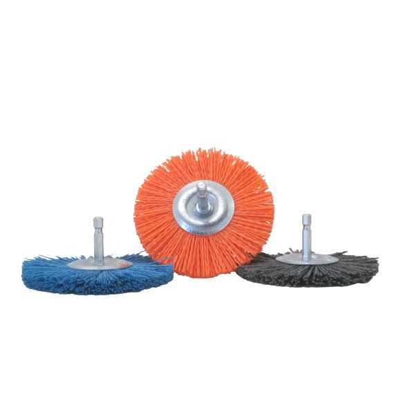 Maintains shape and will not rust. Will not shed bristles under normal conditions. Abrasive grit is impregnated throughout each bristle. Safer to use, will not puncture skin. 3 in and 4 in Mandrel mounted wheel brushes, ideal for getting into crevices and contours. Applications: removing paints, corrosion, weld scale, surface rust and burns from metals. Prepare plastic, fiberglass and rubber surfaces for adhesives. Preparing metal surfaces for primers and paint. Cleaning unfinished tile, stone, cement and brick mortar. Removing old paint and finishes from wood. Cleaning and sanding wood turnings, railings, banisters, trim and molding. Rounding and blending edges, cutouts and joinings.