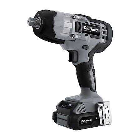 The DieHard 1/2″ Cordless Impact Wrench has a max torque rating of 300 ft/lb and includes 2 variable speeds. This wrench includes a high-performance carbon brushed motor, as well as an LED light making this an excellent tool for both dark and tight places. Also included are both a 20v battery and fast charger. Product Features: Variable Speed Trigger No-Load Speed: 0-2200 RPM Impact Speed: 0-2300 BPM 1/2″ Square Chuck High-Performance Carbon Brushed Motor Nut Busting Torque 300 Ft-Lbs (407 N.m) Built-in LED light Belt Loop 20V 2.0Ah Lithium-ion battery included 20V Quick Battery Charger included Battery charges in approximately 1 hour